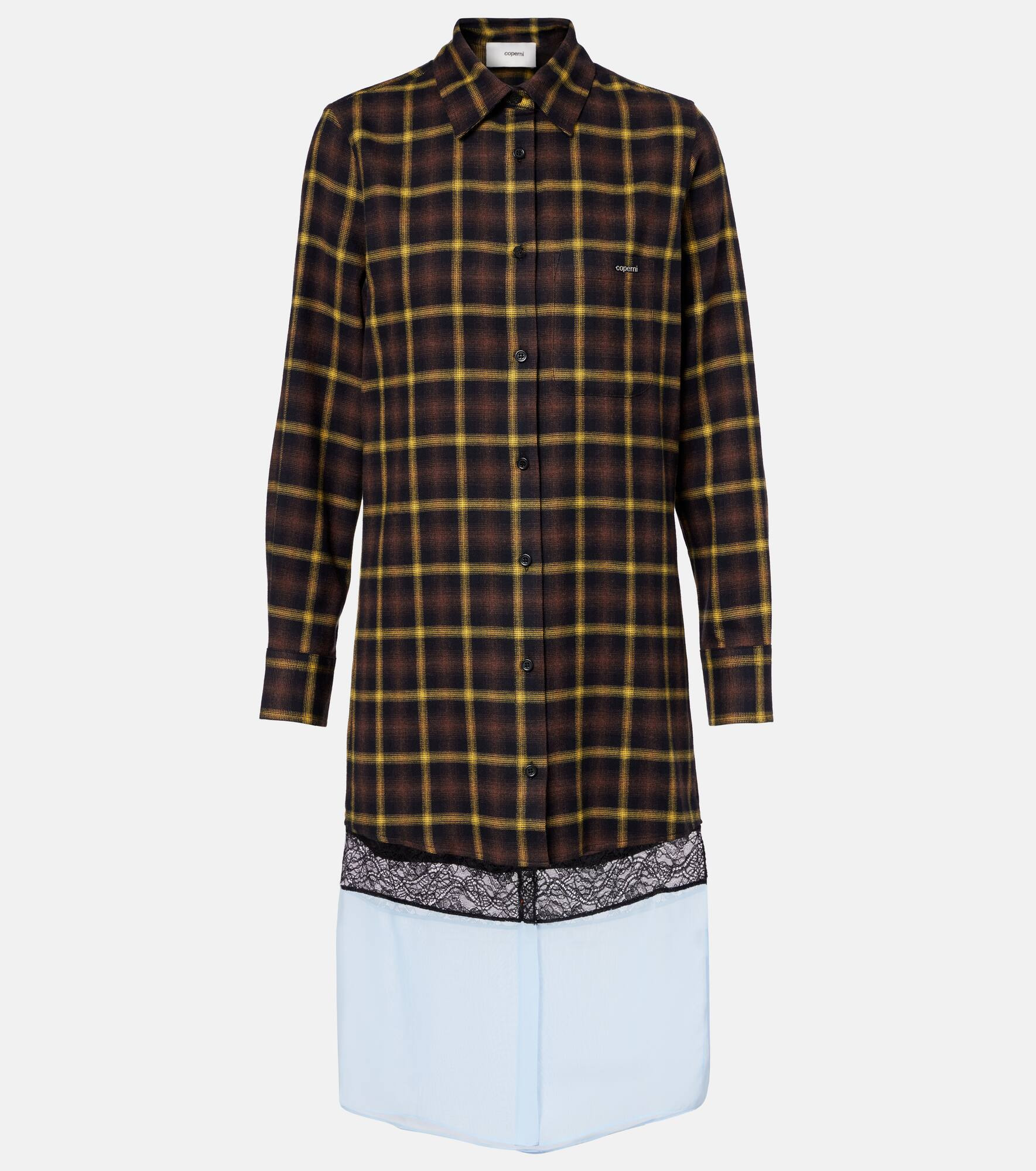 Coperni takes its name from the astronomer Nicolaus Copernicus, whose precise work inspires the brand’s deeply detailed designs. Crafted from pure cotton with a lower mesh panel, this shirt dress is tailored to a knee-length and features a checked pattern. Product Details - Material: 100% cotton - Care instructions: hand wash cold - Made in Italy - Designer color name: Brown-Blue - Item color: multicolor - Material II: 100% polyester - Material III: 80% polyamide, 20% elastane - Collar: classic (Straight point) - Cuff: buttoned - Pockets: rounded chest pocket - Closure: buttoned front - Item number: P01100753 Size & Fit - True to size - Straight fit - Non-stretchy fabric - Falls below the hip - The model seen in the picture is 178cm-5'10" and wearing a size FR 36