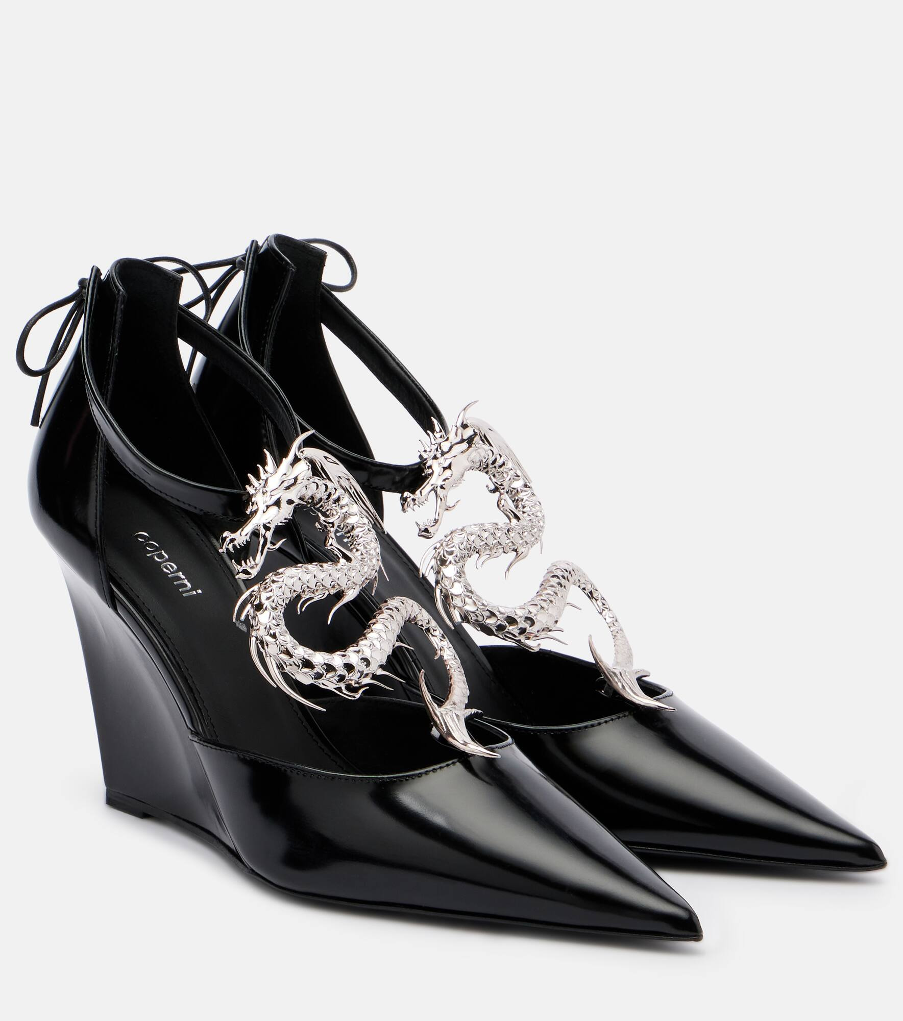 Coperni takes its name after the astronomer Nicolaus Copernicus, whose precise work inspires the brand’s deeply detailed designs. The Dragon leather pumps sit atop wedge heels and boast embellished dragon motifs across the uppers. Product Details - Upper: leather, plastic - Lining: leather - Sole: leather insole and sole - Toe shape: pointed toe - Made in Spain - Includes: dust bag, shoe box - Designer color name: Black - Item color: black - Hardware color: silver - Item number: P01097576 Size & Fit - True to size - Half sizes please take the next size down - European sizes - 9,5cm-3.5" heel (size EU 38)