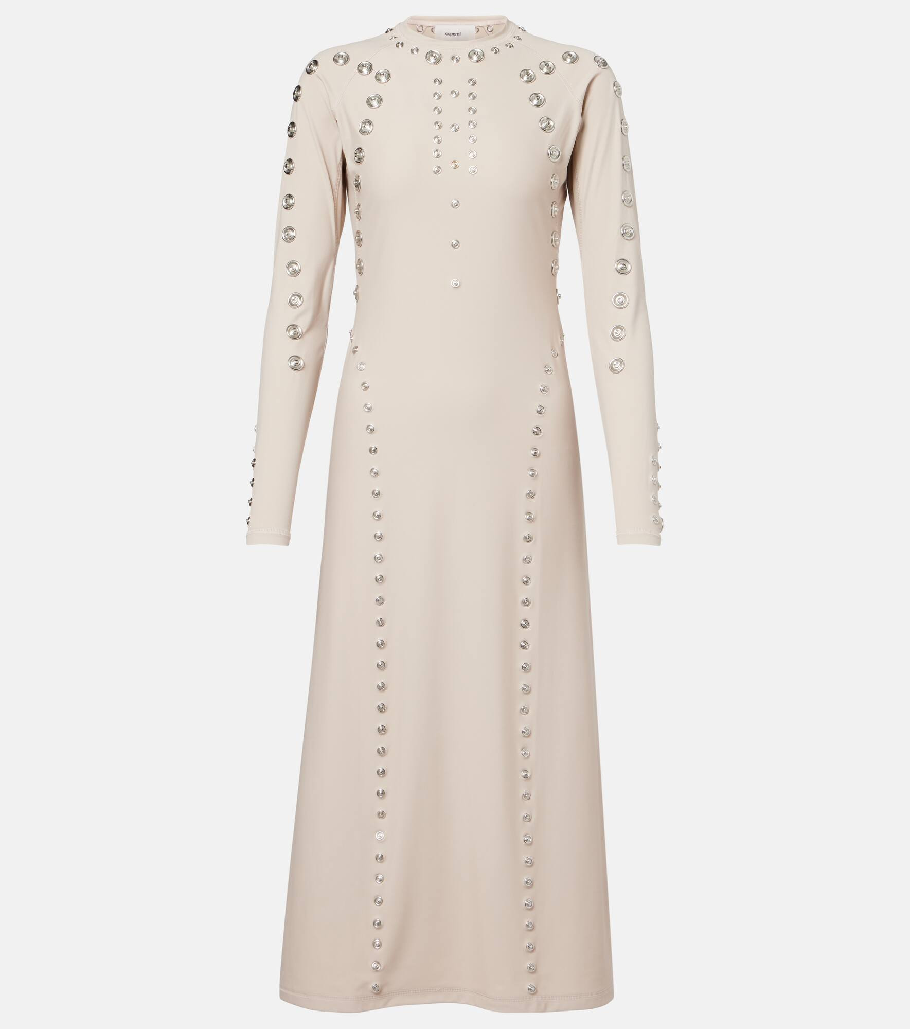 Coperni takes its name after the astronomer Nicolaus Copernicus, whose precise work inspires the brand’s deeply detailed designs. The Snap midi dress is tailored to an A-line silhouette and detailed with button embellishments in varying sizes. Product Details - Material: 78% polyamide, 22% elastane - Care instructions: dry clean - Made in Portugal - Designer color name: Beige - Item color: beige - Hardware color: brass - Item number: P01090556 Size & Fit - True to size - Cinched waist - Stretchy fabric - The model seen in the picture is 178cm-5'10" and wearing a size XS