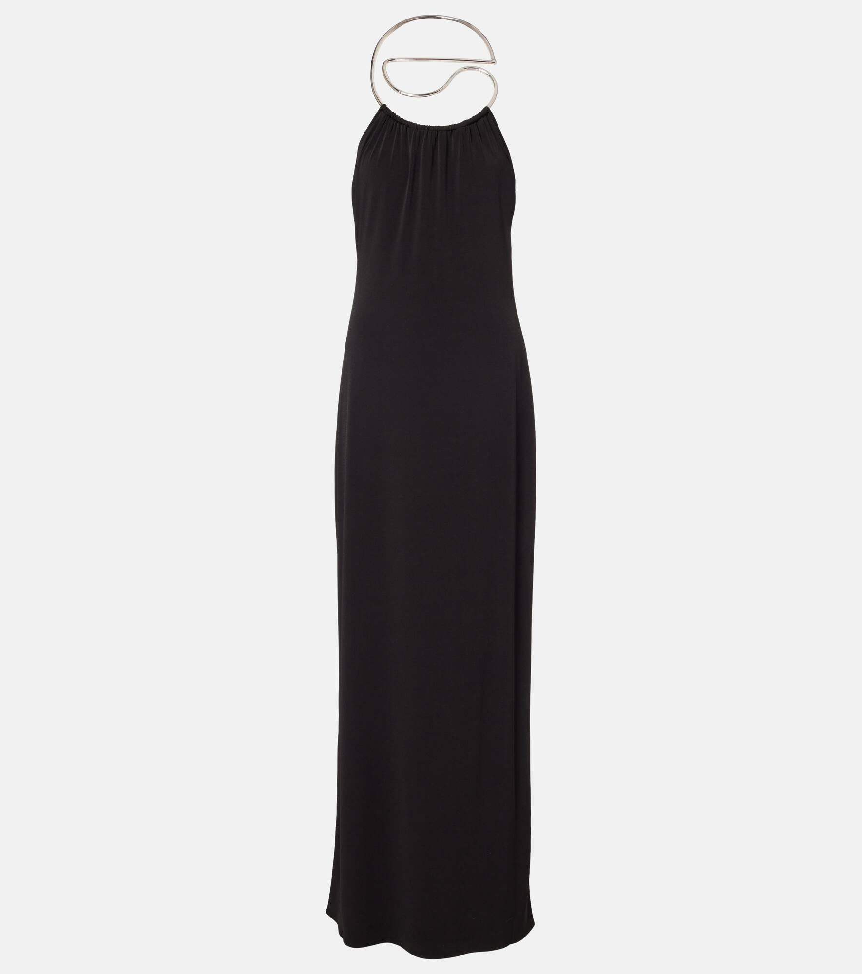 Coperni takes its name after the astronomer Nicolaus Copernicus, whose precise work inspires the brand’s deeply detailed designs. This sleek gown with a minimalist silhouette features a halter neckline accented by an integrated logo necklace, making a refined statement. Product Details - Material: 95% polyester, 5% elastane - Care instructions: machine wash at 30 degrees - Made in France - Designer color name: Black - Item color: black - Detachable collar - Item number: P01090550 Size & Fit - True to size - Low back - Fitted - Slightly stretchy fabric - The model seen in the picture is 178cm-5'10" and wearing a size XS