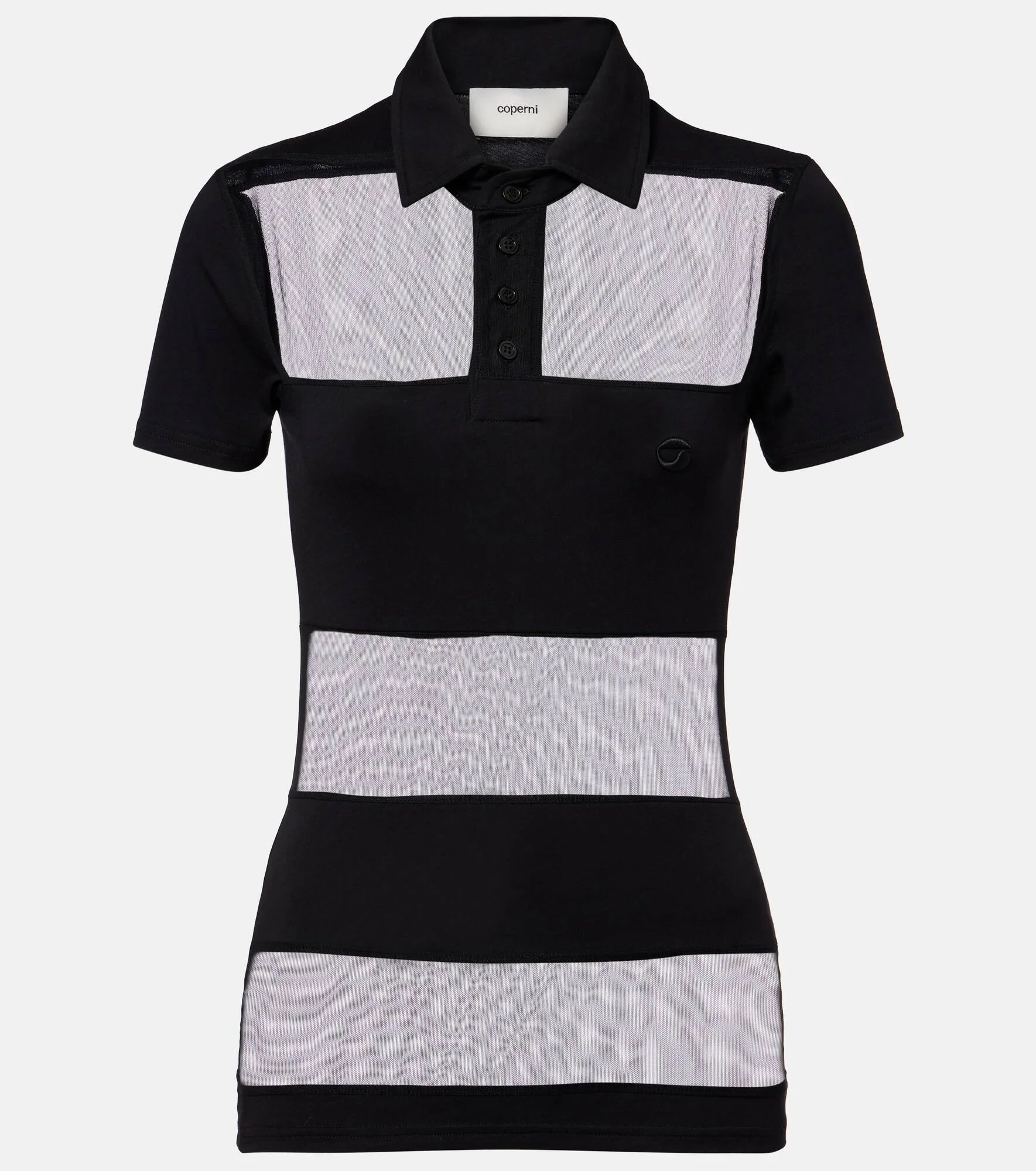 Coperni takes its name after the astronomer Nicolaus Copernicus, whose precise work inspires the brand’s deeply detailed designs. Coming in a polo-inspired silhouette, this crop top is constructed from stretchy cotton blend and mesh panels. Product Details - Material: 50% cotton, 41% polyamide, 9% elastane - Care instructions: machine wash at 30 degrees - Made in Portugal - Color: black - Designer color name: Black - Item color: black - Collar: polo collar - Item number: P01142084 Size & Fit - True to size - Semi-sheer - Fitted - Slightly stretchy fabric - Falls to the hip - The model seen in the picture is 178cm-5'10" and wearing a size XS