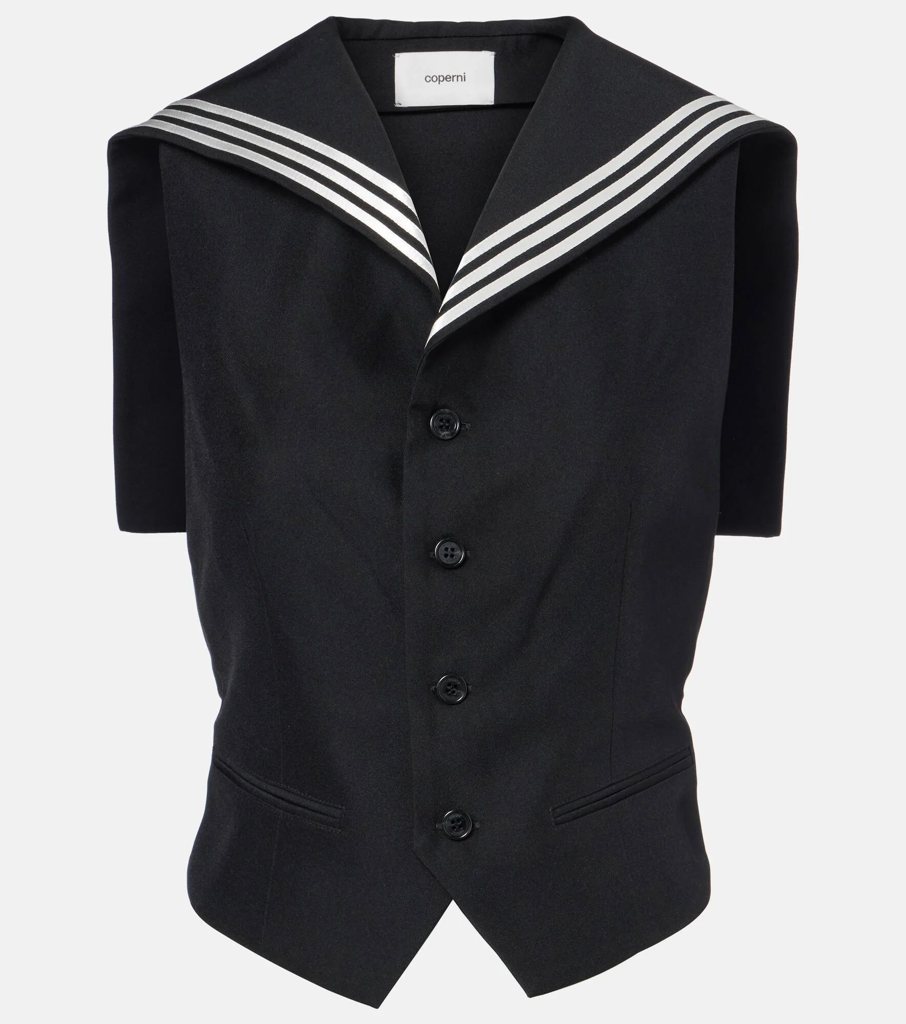 Coperni takes its name after the astronomer Nicolaus Copernicus, whose precise work inspires the brand’s deeply detailed designs. This vest is crafted in Italy and features a buttoned front and a V-neckline adorned with contrasting stripes. Product Details - Material: 100% polyester (recycled) - Care instructions: dry clean - Made in Italy - Designer color name: Black - Item color: black, white - Lining: 52% acetate, 48% viscose - Hardware color: silver - Collar: V-neck - Pockets: jetted - Closure: buttoned front - Item number: P01100751 Size & Fit - True to size - Low back - Cinched waist - Adjustable at the waist - Non-stretchy fabric - Slightly cropped - The model seen in the picture is 178cm-5'10" and wearing a size FR 36