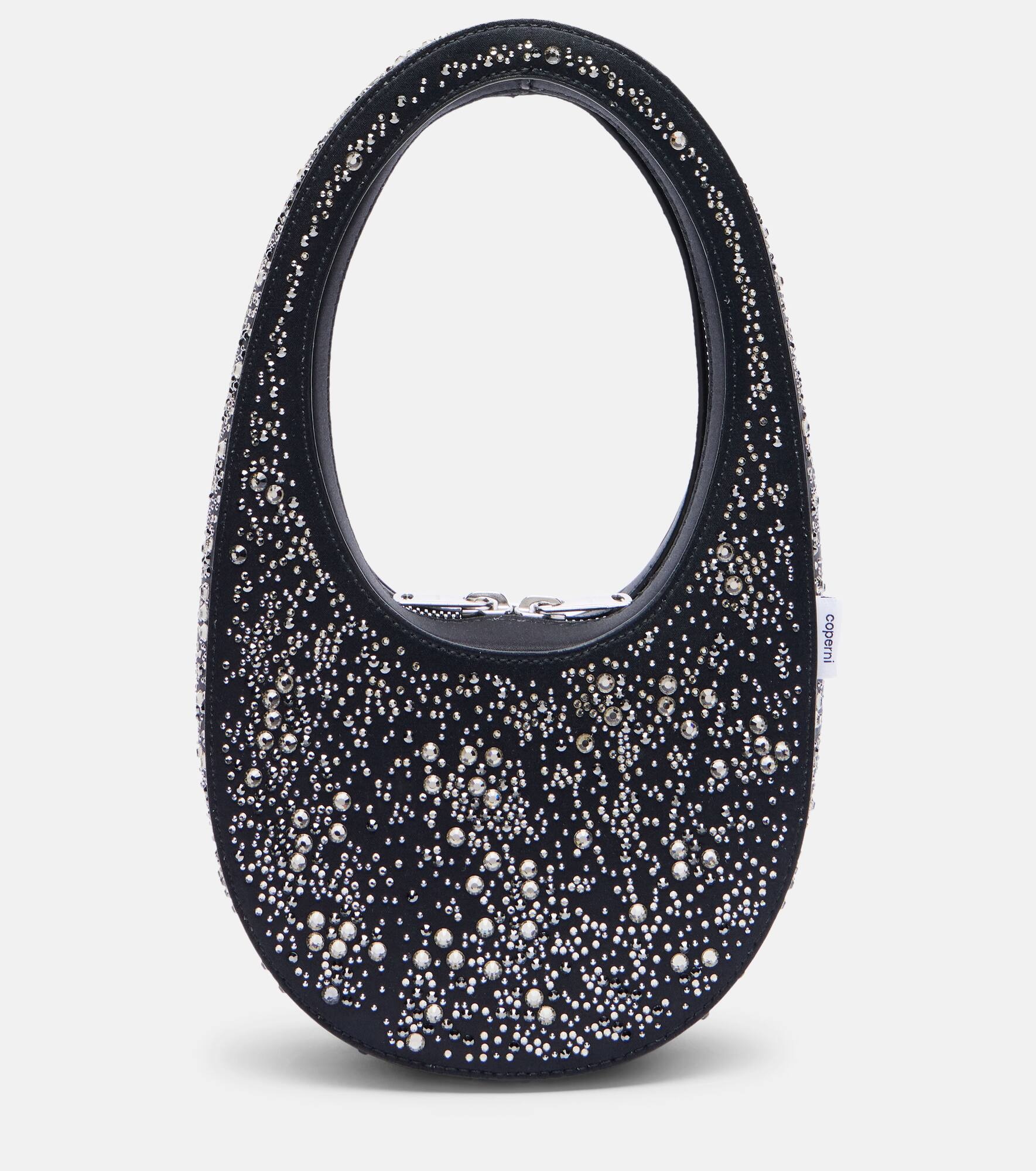 This iteration of Coperni's iconic oval-shaped Swipe tote bag features all-over crystal embellishments that catch the light in every direction. The design is complete with a 360° hidden zip closure that traces the inner handle. Product Details - Material: faux leather - Lining: faux leather - Made in Italy - Designer color name: Black-Silver - Item color: black - Item number: P01008522 Size & Fit - Height 27,5cm-11" - Width 15,5cm-6" - Depth 6cm-2.5" - Length of handle 37cm-14.5"