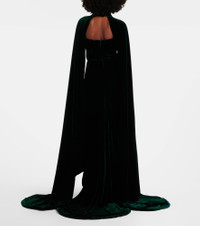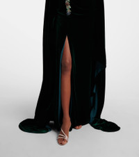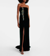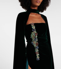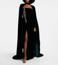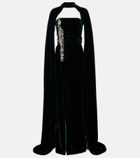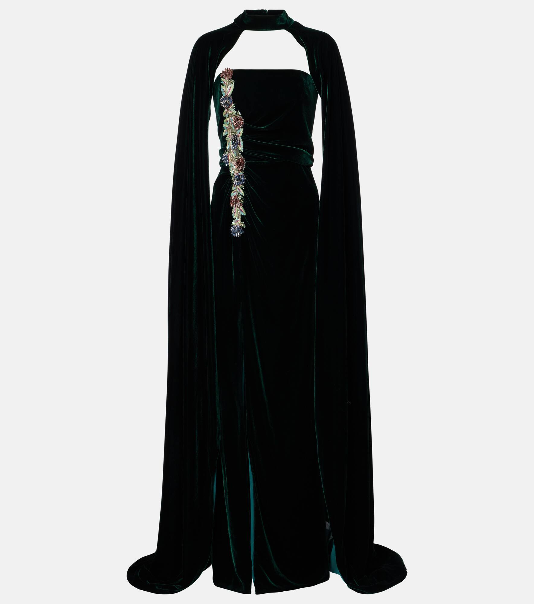 Based in Athens, Costarellos designs ethereal eveningwear that takes inspiration from art of ancient Greece. A majestic example, the Brisha gown is cut from crystal-embellished velvet to a caped silhouette, which deploys to floor length. Product Details - Material: 60% rayon, 25% silk, 15% polyester - Care instructions: dry clean - Made in Greece - Designer color name: Dark Green 826 - Item color: green - Boning - Closure: concealed zipped back - Detachable band - Long vent - Hem: uneven - Item number: P01080024 Size & Fit - True to size - Ideal fit for larger bust sizes - Strapless - Internal boned corset for support - Fitted - Loose outer layer - Non-stretchy fabric - slit length 79cm-31" - The model seen in the picture is 178cm-5'10" and wearing a size FR 36