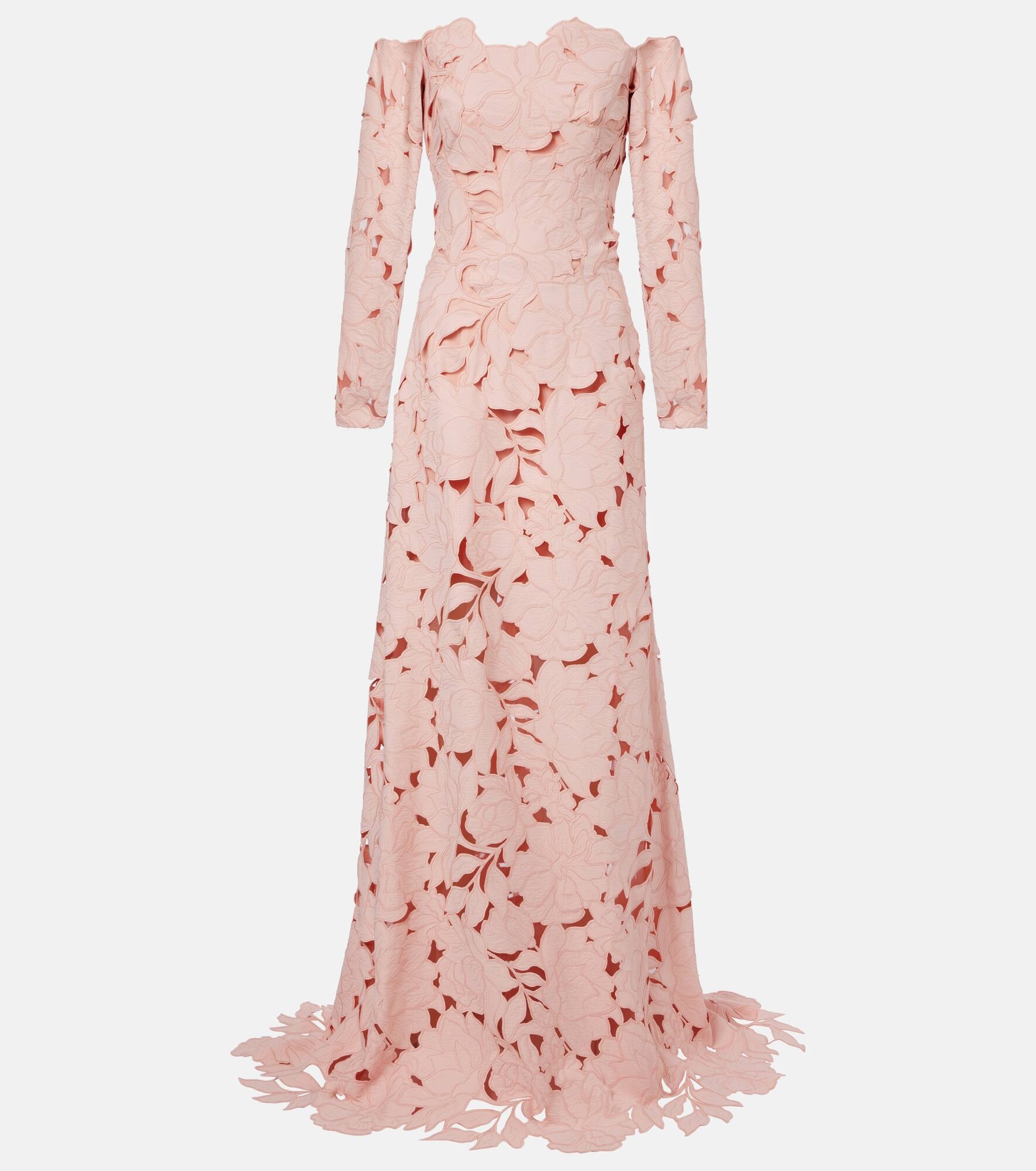Primed for special occasions, the Kasia gown from Costarellos showcases the brand's dedication to sophisticated allure. Made from floral corded lace, the style is complete with an off-shoulder neckline, bow accents, and captivating cutouts at the back. Product Details - Material: 100% polyester - Care instructions: dry clean - Made in Greece - Designer color name: Pink - Item color: pink - Lining: 65% polyamide, 35% polyester - Item number: P01026229 Size & Fit - True to size - Low back - Off-the-shoulder - Internal boned corset for support - Cinched waist - Non-stretchy fabric - The model seen in the picture is 178cm-5'10" and wearing a size FR 40