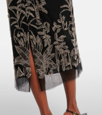 The Leyla tulle midi skirt by Costarellos steals the spotlight with its glamorous design that flaunts beaded botanical motifs. Made from delicate tulle, this garment features a fitted skirt underneath the sheer outer layer for added coverage. Product Details - Material: 100% polyamide - Care instructions: dry clean - Made in Greece - Designer color name: Black-Silver embro - Item color: black, silver - Embroidery: 75% glass, 15% polyester, 10% brass - Lining: 100% polyamide - Closure: zip and hook fastening - Short vent - Fully lined - Item number: P01058415 Size & Fit - True to size - Non-stretchy fabric - slit length 33cm-13" - The model seen in the picture is 178cm-5'10" and wearing a size FR 36