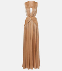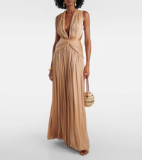 Based in Athens, Costarellos designs ethereal eveningwear that takes inspiration from art of ancient Greece. The Silla gown embodies sculptural simplicity with gathering and cutout details. The fully lined design is zipped and buttoned at the back. Product Details - Material: 100% polyester - Care instructions: dry clean - Made in Greece - Designer color name: Beige Gold 835 - Item color: gold - Closure: zipped back, buttoned back - Fully lined - Item number: P01058452 Size & Fit - True to size - Low back - Cinched waist - Non-stretchy fabric - The model seen in the picture is 178cm-5'10" and wearing a size FR 36