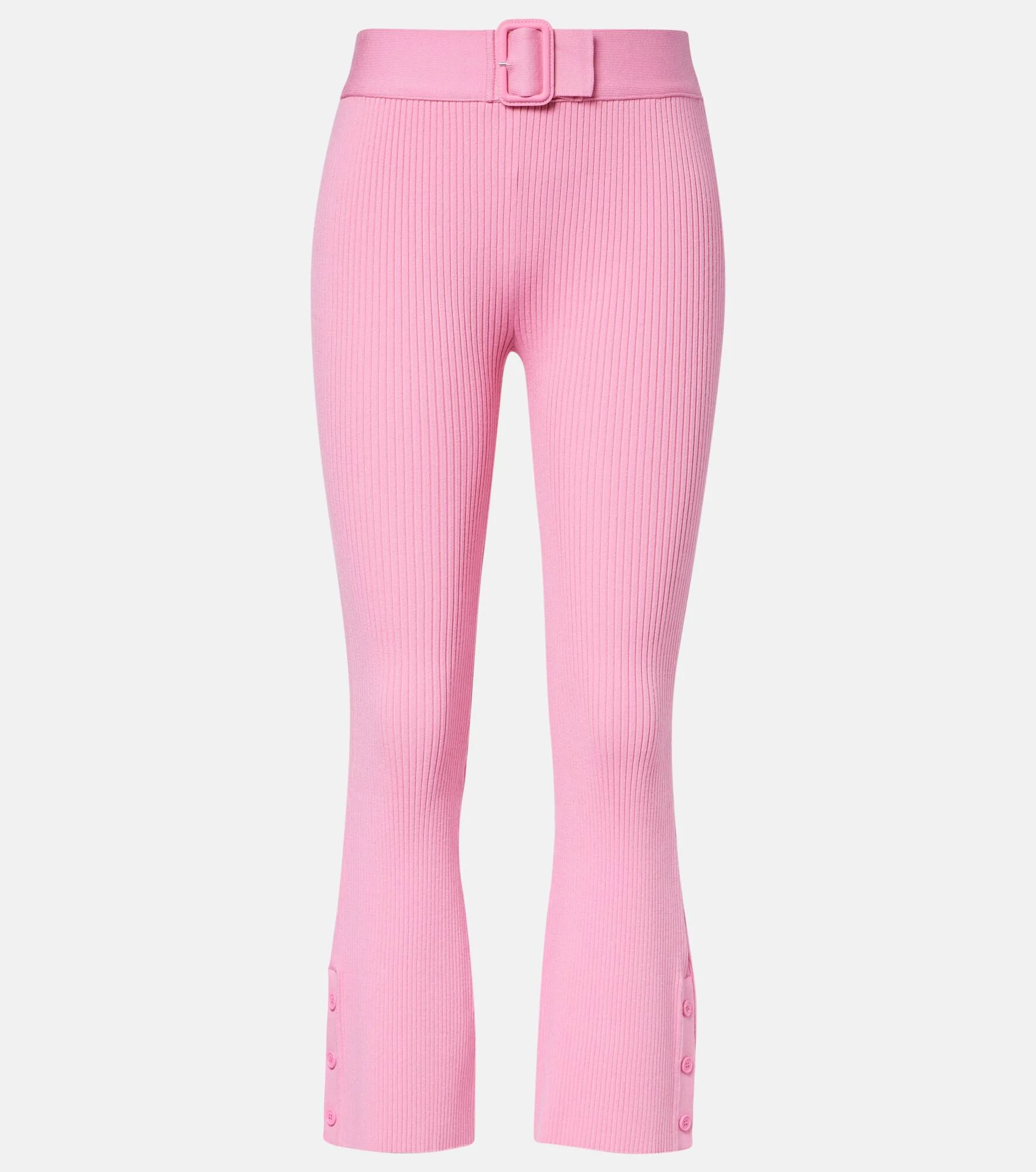 Defined by modern craftsmanship, Courreges elevates everyday essentials. These pink Capri ribbed-knit pants offer a flattering, comfortable fit with a contemporary silhouette, blending casual ease with refined, modern style. Product Details - Material: 70% viscose, 30% polyester - Care instructions: hand wash - Made in Bulgaria - Color: pink - Designer color name: Party Pink - Elasticated waistband - Closure: concealed zipped side, buckle fastening - Item number: P01120090 Size & Fit - True to size - Stretchy fabric - Flared - The model seen in the picture is 178cm-5'10" and wearing a size XS
