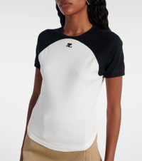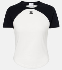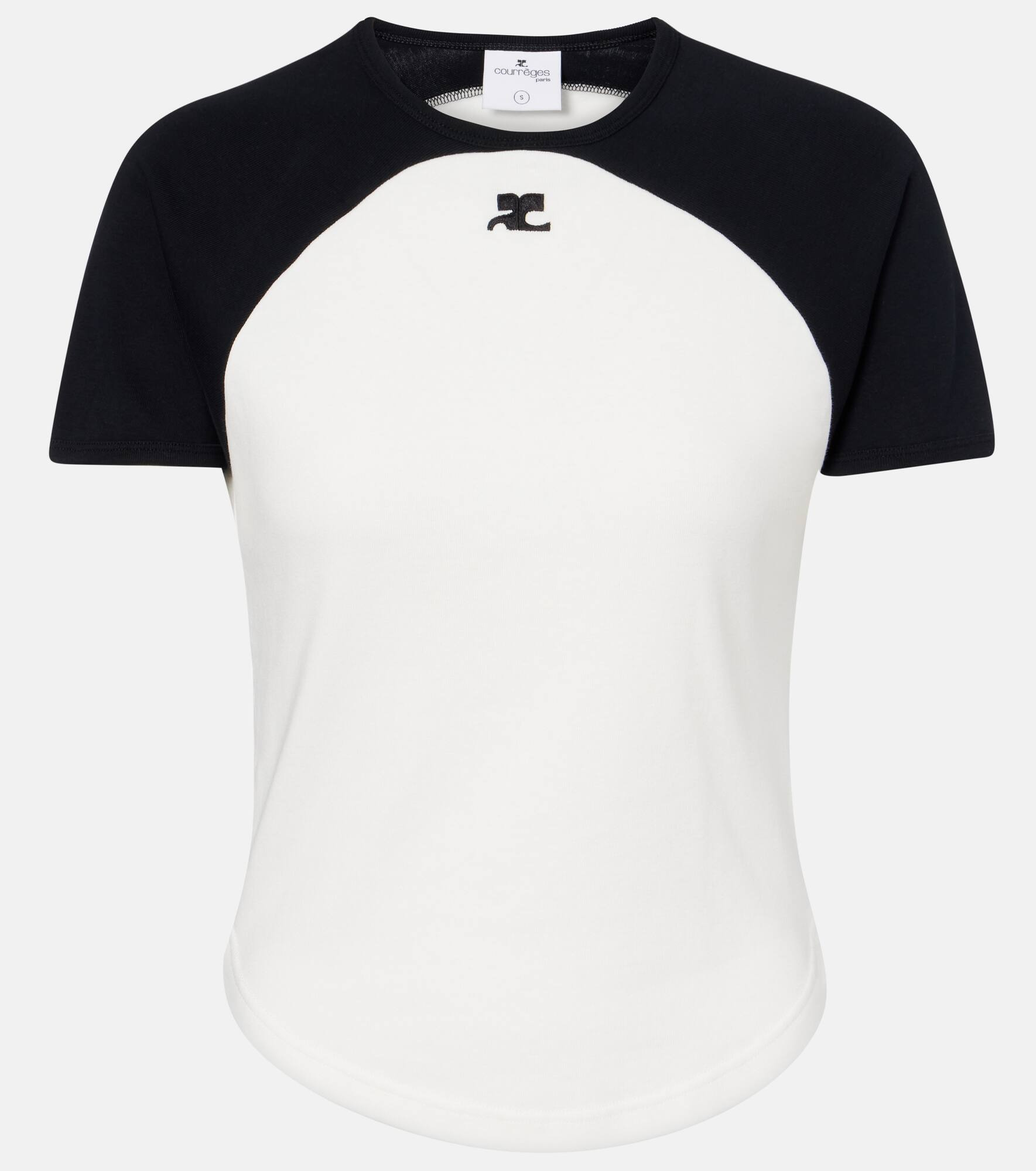 The Circle Contrast T-shirt from Courreges is a casualwear staple that brings a signature touch with its embroidered logo at the front. Crafted from soft cotton jersey, the design boasts a sharp color contrast. Product Details - Material: 100% cotton - Care instructions: machine wash at 30 degrees - Made in Portugal - Designer color name: Heritage White/Black - Item color: white, black - Trim: 100% cotton - Collar: crewneck - Sleeves: raglan - Hem: rounded - Item number: P01072195 Size & Fit - True to size - Fitted - Slightly stretchy fabric - Slightly cropped - The model seen in the picture is 178cm-5'10" and wearing a size XS