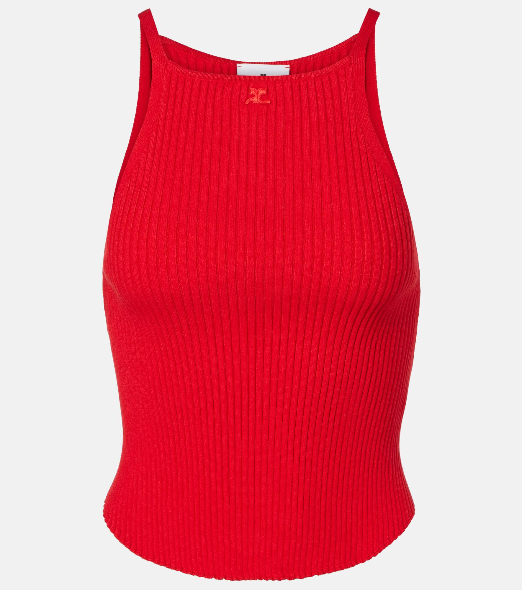The Circle ribbed-knit tank top by Courreges is perfect worn solo or layered. This stylish piece features slim straps, an embroidered AC logo beneath the neckline, and an uneven hem. Product Details - Material: 70% viscose, 30% polyester - Care instructions: hand wash - Made in Bulgaria - Designer color name: Poppy - Item color: red - Lining: 70% viscose, 30% polyester - Hem: uneven - Item number: P01072205 Size & Fit - True to size - Cinched waist - Stretchy fabric - Cropped - The model seen in the picture is 178cm-5'10" and wearing a size XS