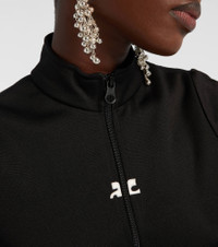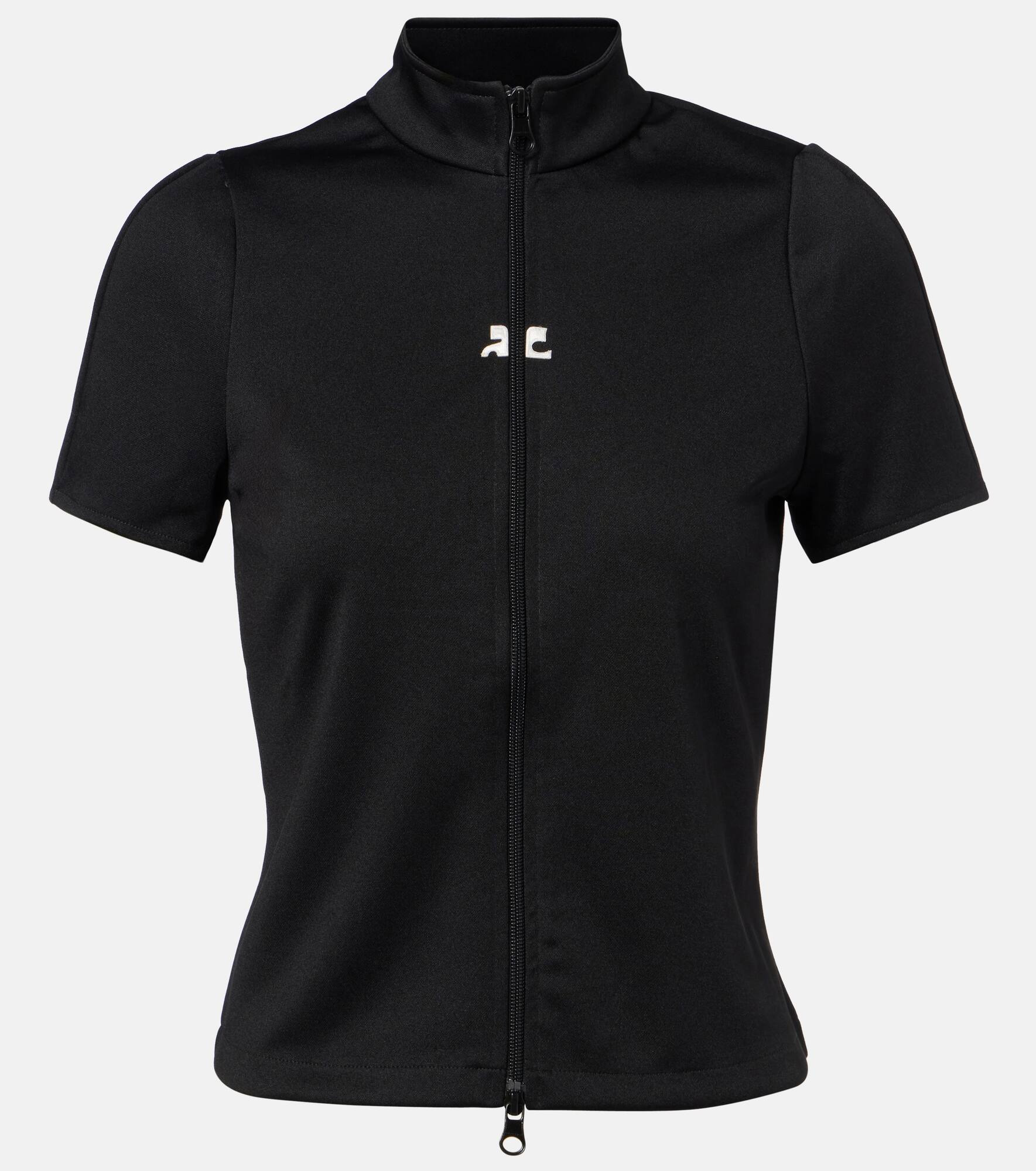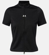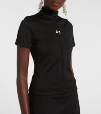 The futurist French fashion house Courreges is rocketing back into orbit with hyper-modern designs rooted in space-age influence. Crafted from technical jersey, the tracksuit-style Interlock top features a zip-up front, logo embroidery, and mock neck. Product Details - Material: 100% polyester - Care instructions: machine wash at 30 degrees - Made in Tunisia - Designer color name: Black - Item color: black - Closure: zipped front - Collar: mockneck - Item number: P01072192 Size & Fit - True to size - Cinched waist - Slightly stretchy fabric - Falls to the hip - The model seen in the picture is 178cm-5'10" and wearing a size XS