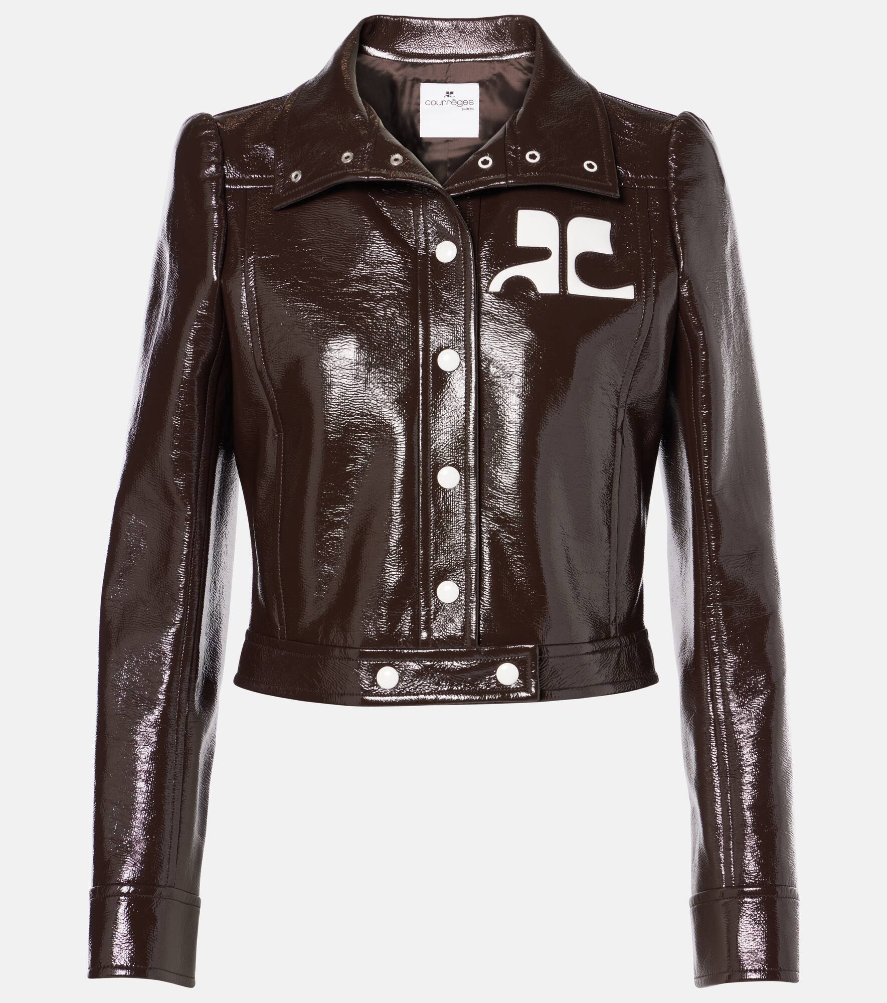 The futurist French fashion house Courreges is rocketing back into orbit with hyper-modern designs rooted in space-age influence. The Reedition jacket is crafted from glossy vinyl and is complete with the brand’s iconic logo. Product Details - Material: 88% cotton, 10% polyurethane, 2% elastane - Care instructions: do not wash - Made in Portugal - Designer color name: Chocolate - Lining: 100% cupro - Closure: snap-buttoned fastenings - Pockets: snap-buttoned pockets - Item number: P00997410 Size & Fit - True to size - Straight fit - Non-stretchy fabric - Cropped - The model seen in the picture is 178cm-5'10" and wearing a size FR 36