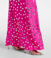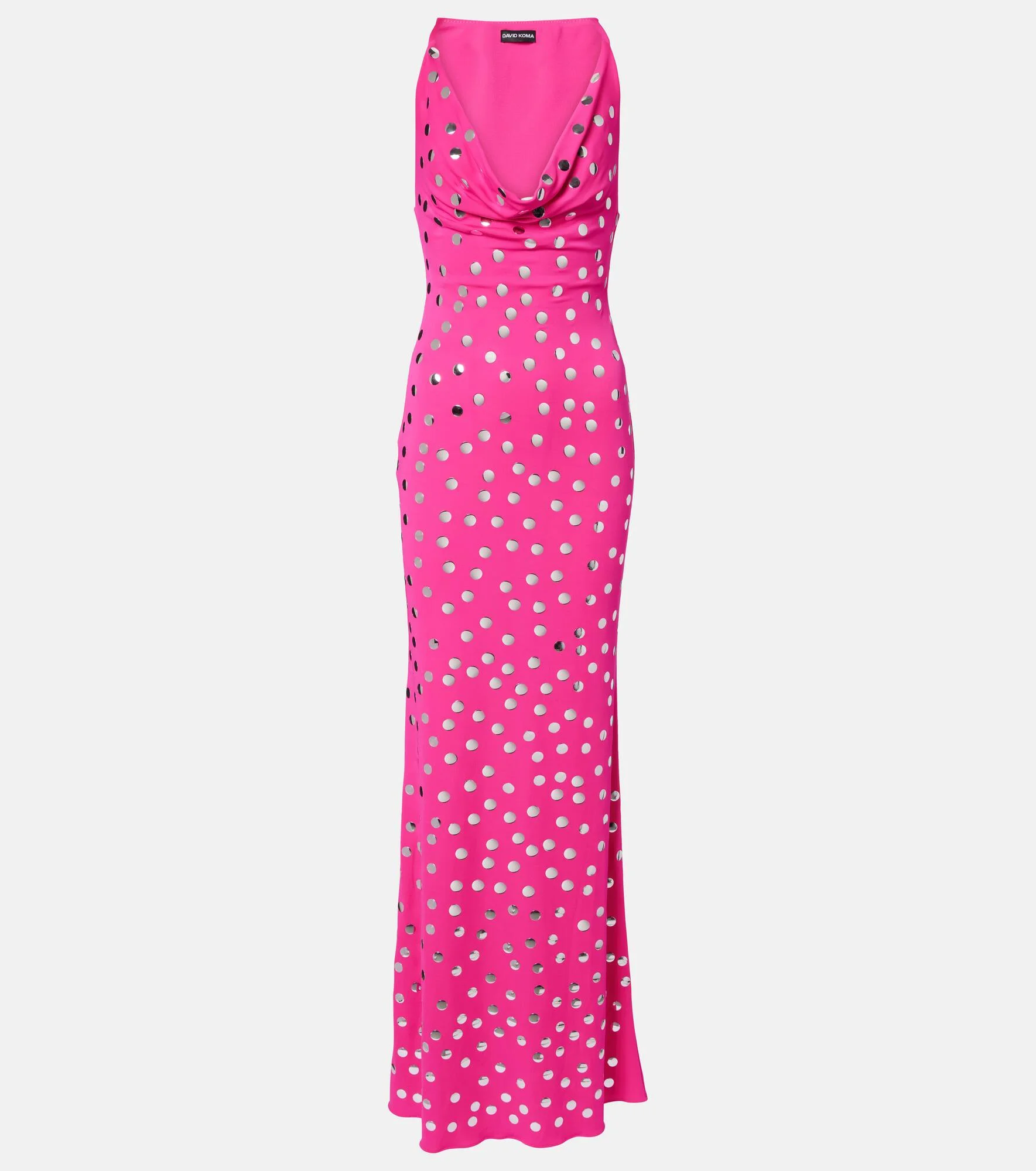 David Koma's glamorous styles are the key to making an entrance when it matters the most. This gown features an elegant cowl neckline and showcases all-over silver-toned polka dots for a dazzling touch. Product Details - Material: 95% polyester, 5% elastane - Care instructions: dry clean - Made in the UK - Designer color name: Fuchsia/Silver - Item color: pink - Insert: 100% aluminum - Hardware color: silver - Collar: cowl neck - Item number: P01080145 Size & Fit - True to size - Fitted - Stretchy fabric - The model seen in the picture is 178cm-5'10" and wearing a size UK 8