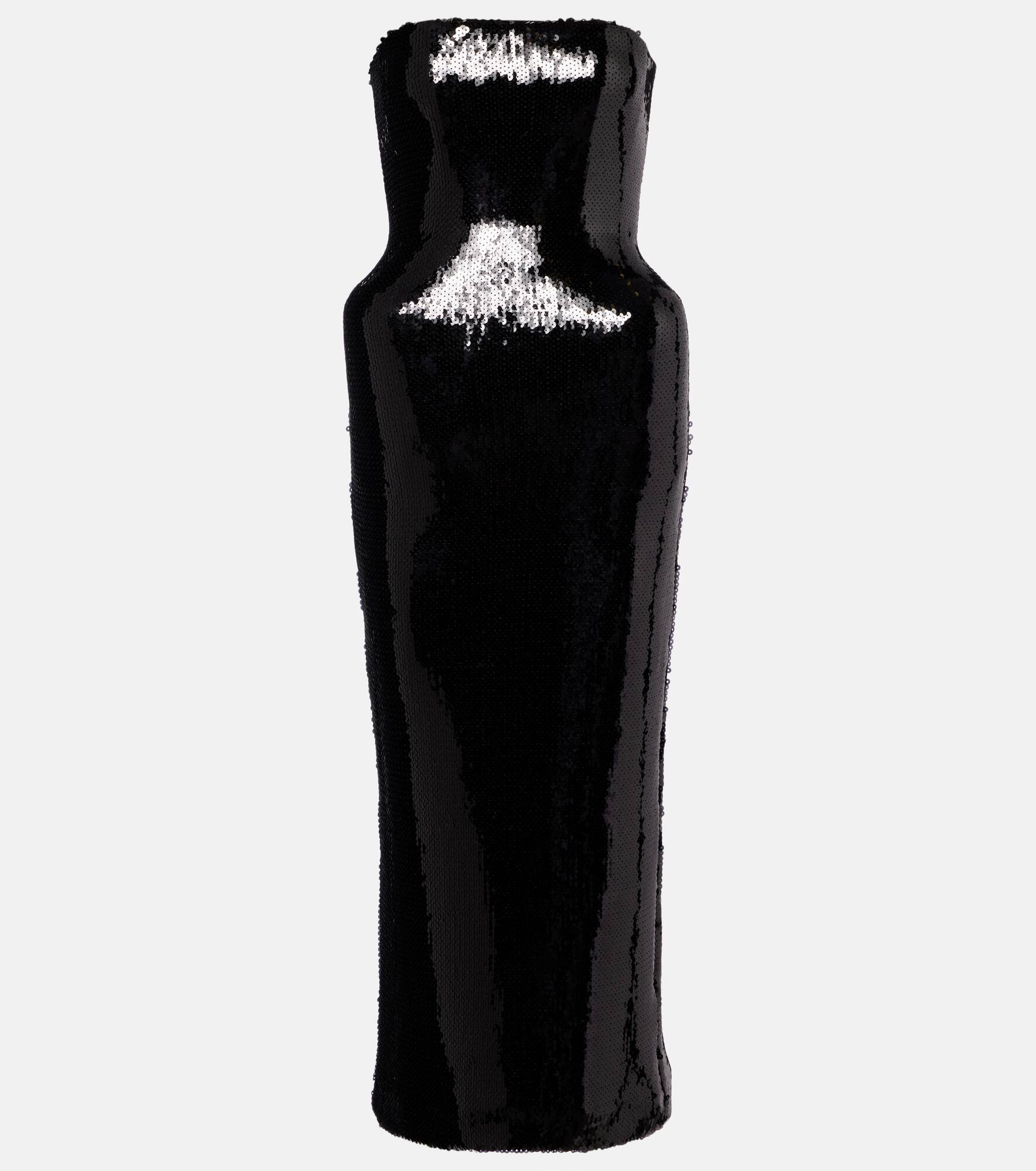 David Koma's glamorous styles are the key to making an entrance when it matters the most. Complete with a bustier bodice, this dress is cut to a midi length and features all-over sequins and exaggerated padded hips. Product Details - Material: 100% polyester - Care instructions: dry clean - Made in the UK - Designer color name: Black - Item color: black - Lining: 100% cotton - Boning - Padded cups - Closure: concealed zipped back - Item number: P01080177 Size & Fit - True to size - Strapless - Internal boned corset for support - Fitted - Slightly stretchy fabric - The model seen in the picture is 178cm-5'10" and wearing a size UK 8