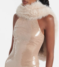 Made for the spotlight, this sleeveless minidress from David Koma is embellished with shimmering sequins. This piece features a faux-fur shawl detail at the neck for added glamour, and an invisible zip closure at the back. Product Details - Material: 90% polyester, 10% polyamide - Care instructions: do not wash - Made in the UK - Designer color name: Beige - Item color: beige - Lining: 64% viscose, 36% polyester - Fully lined - Closure: invisible zipper, zip and hook fastening - Item number: P01051686 Size & Fit - True to size - Low back - Fitted - Non-stretchy fabric - The model seen in the picture is 178cm-5'10" and wearing a size UK 8