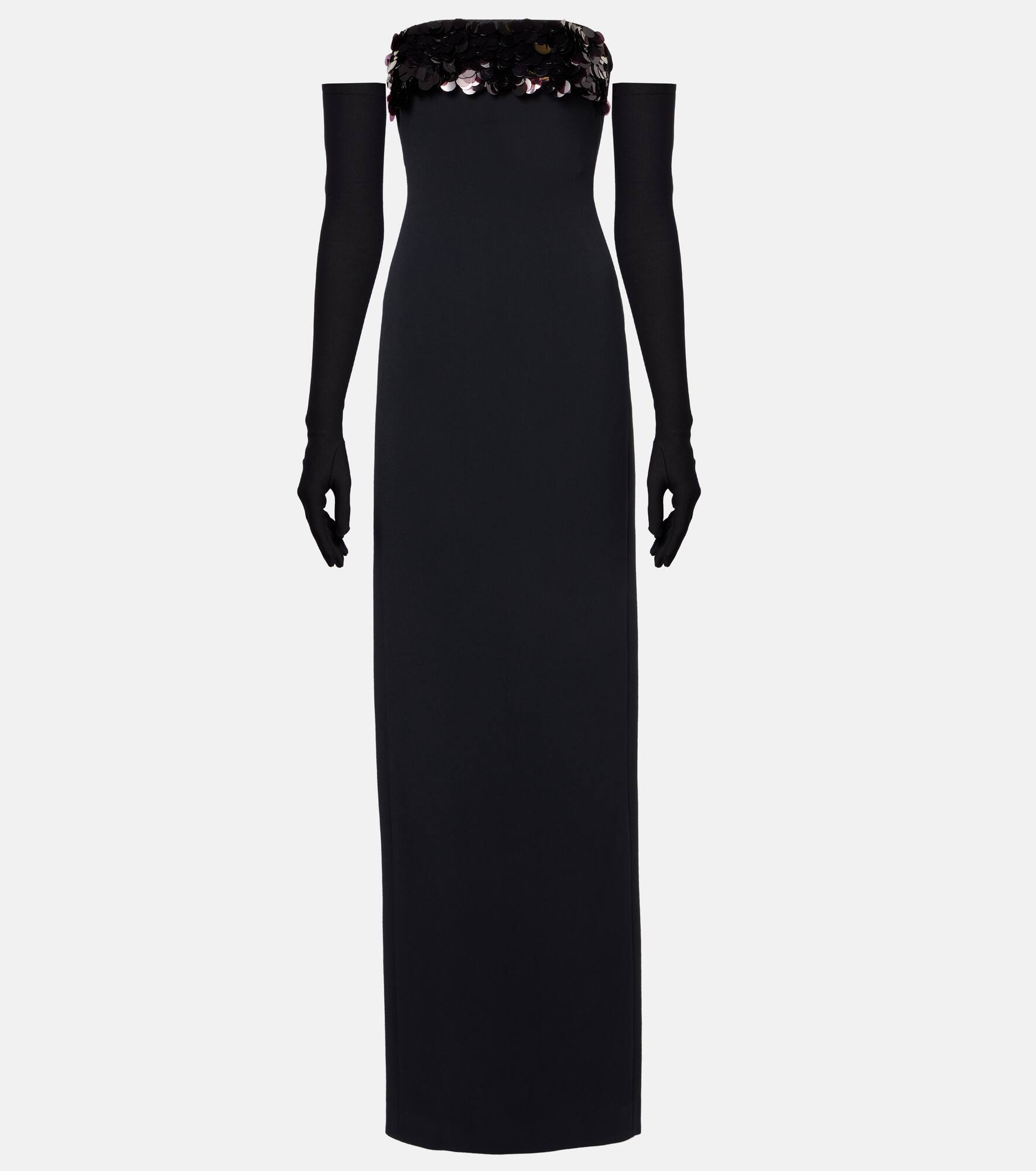 David Koma's glamorous styles are the key to making an entrance when it matters the most. This strapless gown features sequin embellishments at the neckline, internal boning, a center-back slit, and detachable gloves for a refined touch. Product Details - Material: 50% viscose, 47% acetate, 3% elastane - Care instructions: dry clean - Made in the UK - Designer color name: Black/Burgundy - Item color: black, burgundy - Lining: 64% viscose, 36% polyester - Embroidery: 50% vinyl, 50% glass - Closure: zipped back - Boning - Long vent - Fully lined - Detachable gloves - Item number: P01051697 Size & Fit - True to size - Strapless - Fitted - Non-stretchy fabric - slit length 78cm-30.5" - The model seen in the picture is 178cm-5'10" and wearing a size UK 8