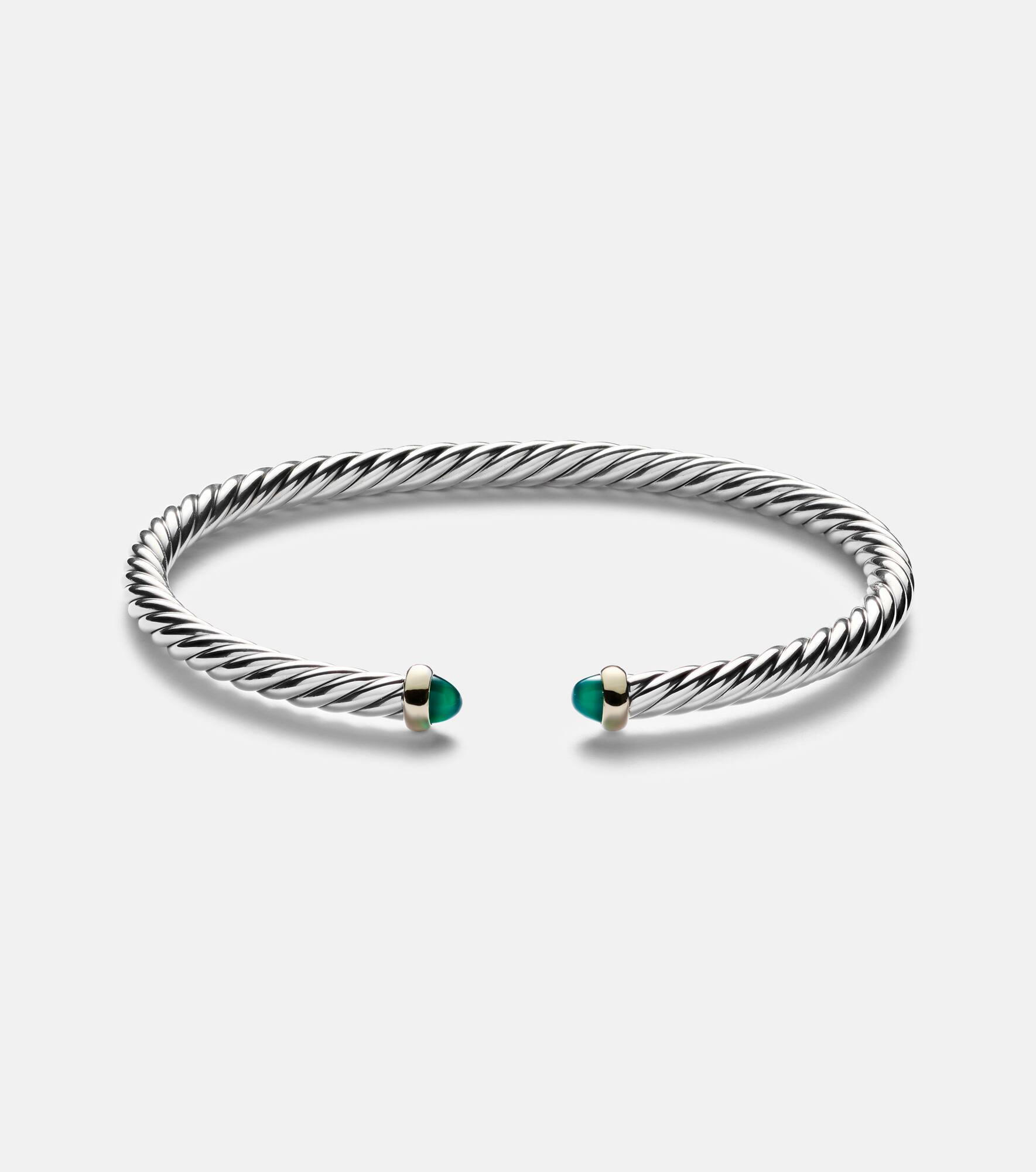 The Cable Flex cuff bracelet from David Yurman is expertly crafted from sterling silver into an intricately twisted 4mm helix design. Finished with 14kt yellow gold details and green onyxes at either end, it features a nitinol core to provide flexible movement. The Cable Flex style is inspired by the original Cable bracelet that was once hand-twisted by the brand's founder, David Yurman, from 50 feet of wire. Product Details - Material: sterling silver, 14kt yellow gold - Made in the USA - Item color: silver - Designer color name: Yellow Gold/Green Onyx - Stone I: onyxes - Item number: P01056859 Size & Fit - Max. width 5mm-0.2" - Circumference size S 15,5cm-6" - Circumference size M 16,5cm-6.5" - Opening 1cm-0.5"