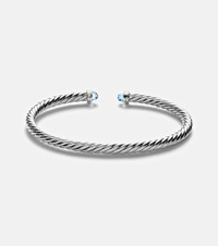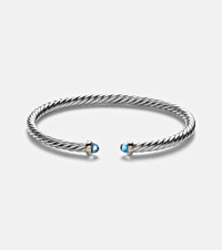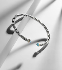 The Cable Flex cuff bracelet from David Yurman is expertly crafted from sterling silver into an intricately twisted 4mm helix design. Finished with 14kt yellow gold details and dazzling blue topazes at either end, it features a nitinol core to provide flexible movement. The Cable Flex style is inspired by the original Cable bracelet that was once hand-twisted by the brand's founder, David Yurman, from 50 feet of wire. Product Details - Material: sterling silver, 14kt yellow gold - Made in the USA - Item color: silver - Stone I: blue topazes - Designer color name: Yg/Blue Topaz - Item number: P01056831 Size & Fit - Max. width 5mm-0.2" - Circumference size S 15,5cm-6" - Circumference size M 16,5cm-6.5" - Opening 1cm-0.5"