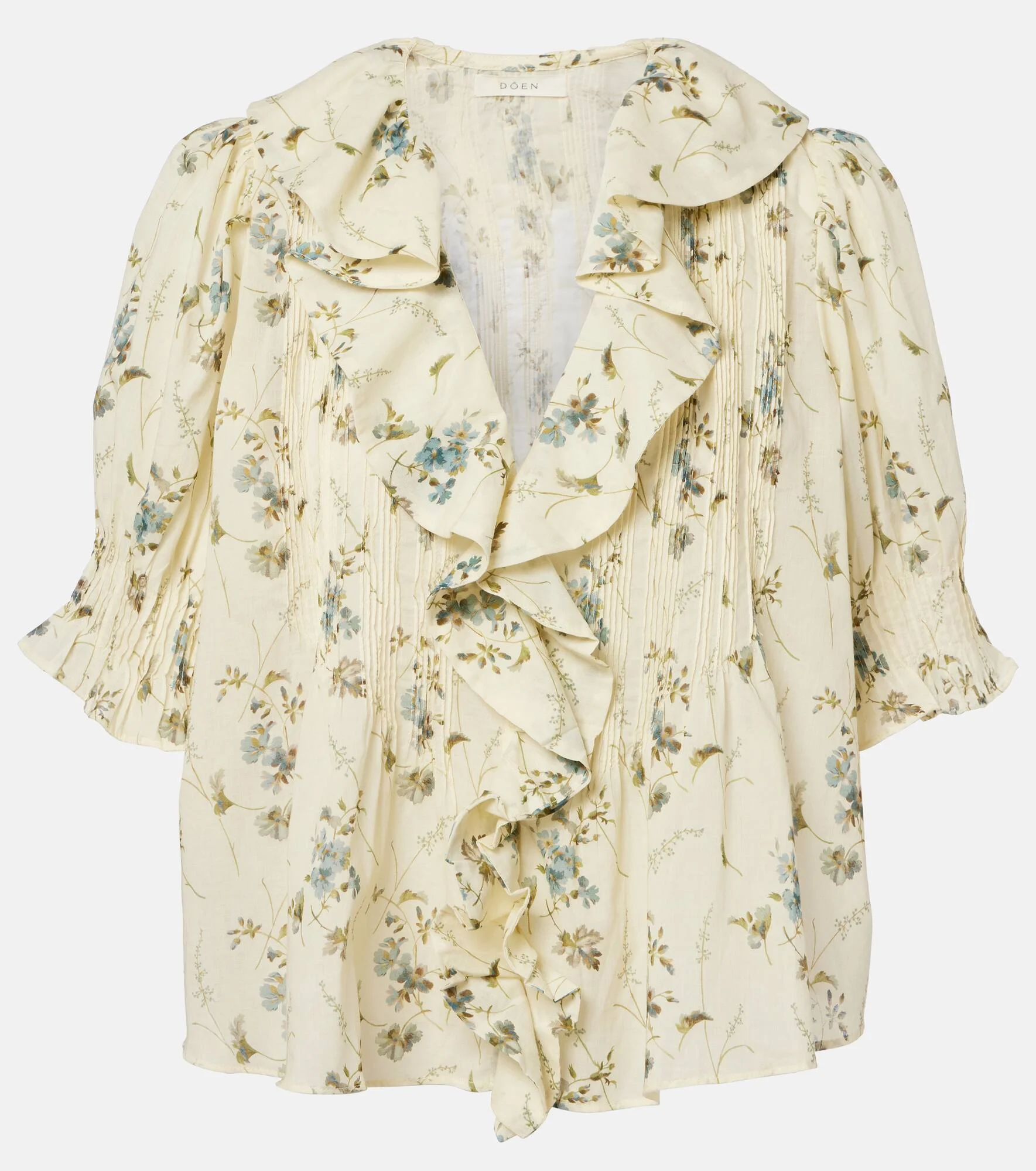 Doen is a female-led brand that celebrates femininity, community, and craftsmanship. Carefully crafted from breezy cotton voile, the Henri top is characterized by its floral print, pleated detailing, and ruffled neckline. Product Details - Material: 100% cotton (organic) - Care instructions: hand wash cold - Made in India - Color: yellow - Designer color name: sunshine Prairie Rose - Closure: buttoned front - Item number: P01155163 Size & Fit - Fits large to size - we recommend trying one size smaller - Designed for a loose fit - Non-stretchy fabric - Falls to the hip - The model seen in the picture is 178cm-5'10" and wearing a size XXS