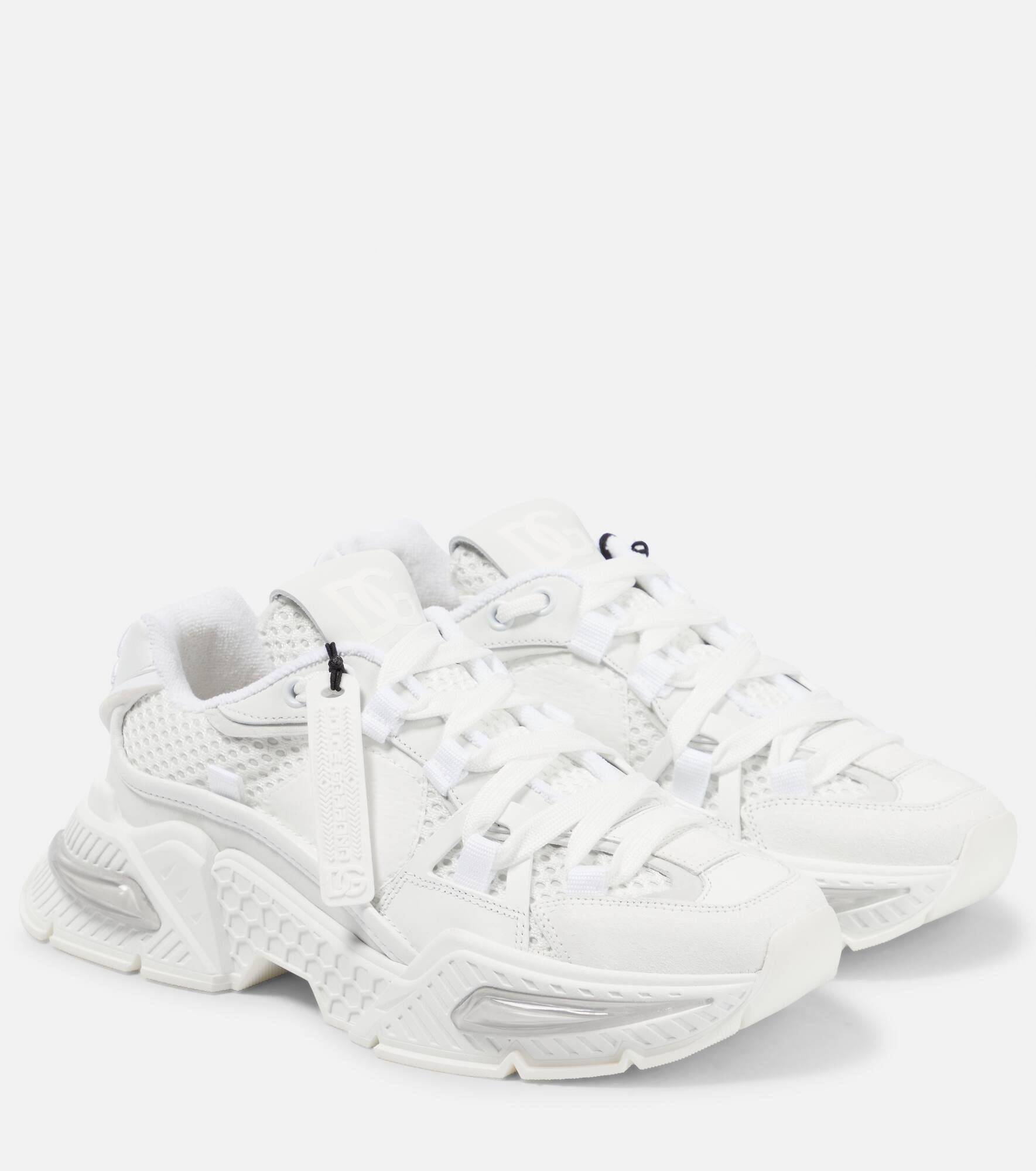 The Airmaster sneakers from Dolce&Gabbana are equal parts sporty and fashion-forward. Adding dimension to the tonal design, the pair is paneled with patches of suede and calfskin and the label boasts the detachable micro-injection logo. Product Details - Sole: leather insole, rubber sole - Toe shape: round toe - Closure: lace-up - Comes with a box - Lining: fabric - Designer color name: Bianco/Bianco - Made in Italy - Comes with dust bag - Upper: fabric, calf leather - Item number: P00769936 Size & Fit - True to size - European sizes - 2,5cm-1" platform (size EU 38) - 4cm-1.5" wedge heel (size EU 38)
