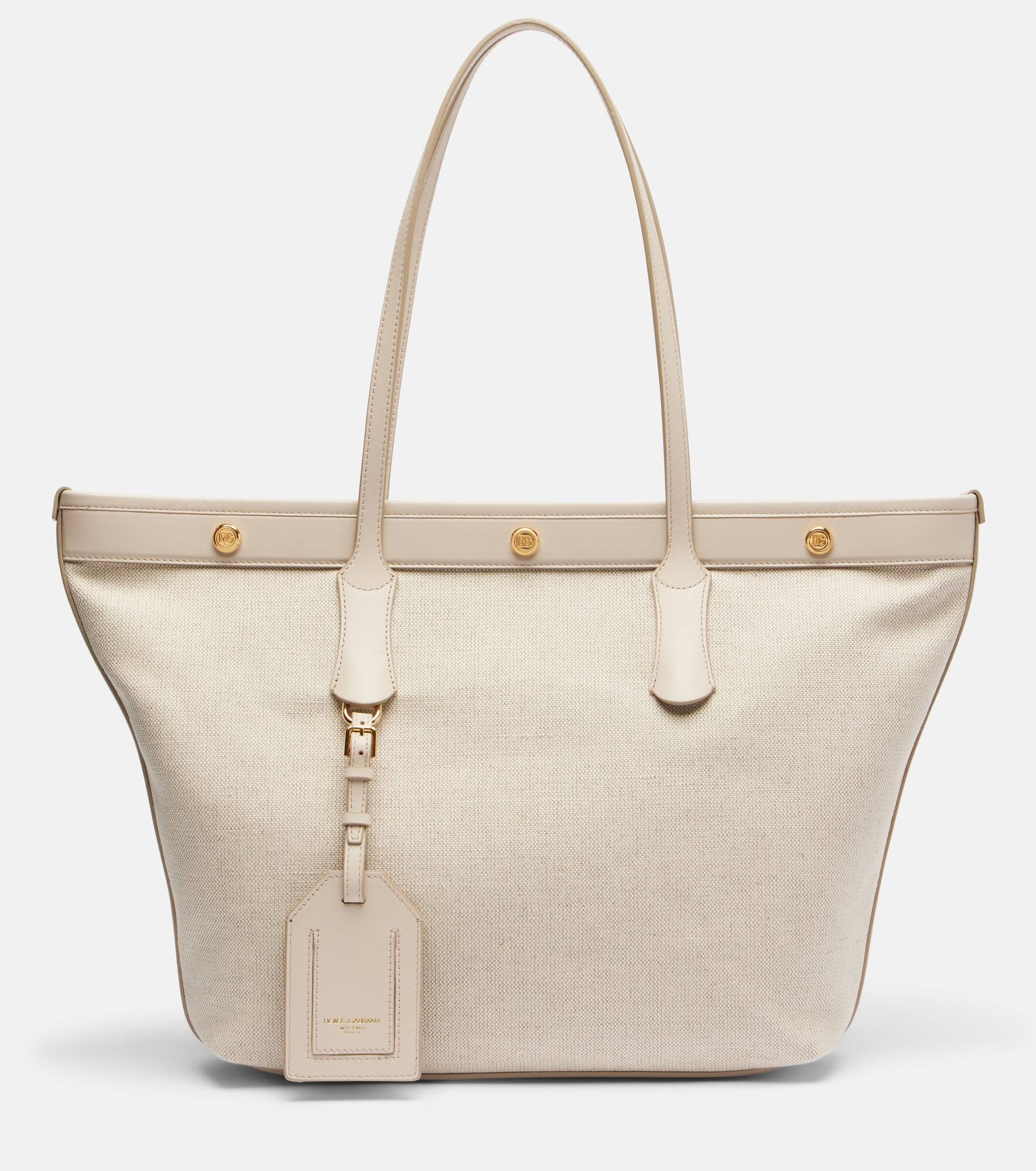 Dolce&Gabbana's attributes most of its bold styles to its Sicilian heritage. This tote bag is crafted in Italy from leather and canvas, featuring a removable zipped pouch, a snap-buttoned closure and gold-toned accents. Product Details - Material: leather, fabric - Lining: fabric, leather - Made in Italy - Designer color name: Avorio/Avorio - Item color: beige - Top handles - Detachable zipped pouch - Closure: snap-buttoned fastening - Includes: dust bag - Item number: P01064554 Size & Fit - Height 30cm-12" - Width 48cm-19" - Depth 9.5cm-3.5" - Length of handles 64cm-25" - Clutch height 14cm-5.5" - Clutch width 21cm-8.5"