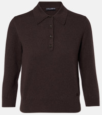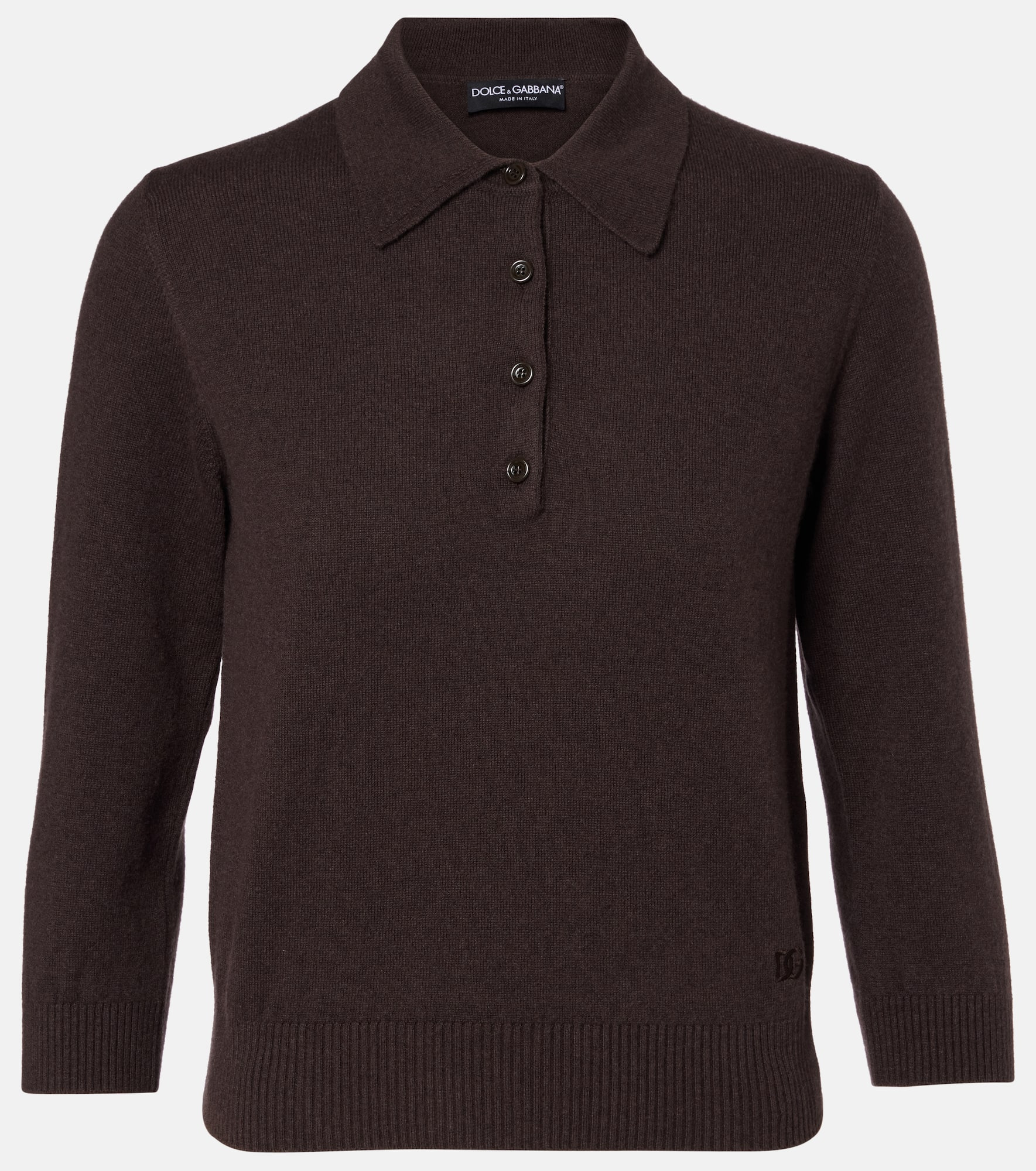 This polo sweater by Dolce&Gabbana feels like a second skin with its close-fitting, soft silhouette. The piece is crafted in Italy from pure cashmere and boasts a classic collar and elbow sleeves. Product Details - Material: 100% cashmere - Care instructions: dry clean - Made in Italy - Designer color name: Deep Brown - Item color: brown - Embroidery: 90% viscose, 10% polyester - Collar: polo collar - Closure: buttoned placket - Cuff: ribbed - Hem: ribbed - Item number: P01052527 Size & Fit - Fits small to size - we recommend trying one size larger - Straight fit - Slightly cropped - Height of model is 178cm-70" and wears a size IT 42