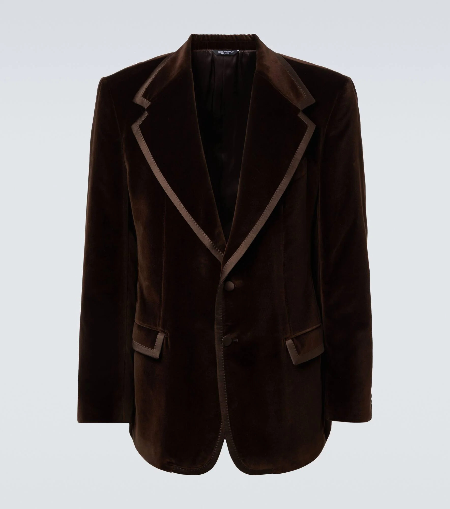 Sicilian culture is on display in Dolce&Gabbana's aesthetic, with bold styles inspired by the brand's Italian heritage. Made from cotton and silk velvet, this blazer features padded shoulders, a sleek notched lapel, and a two-button closure. Product Details - Material: 90% cotton, 8% silk, 2% polyester - Care instructions: dry clean - Made in Italy - Designer color name: Marrone-Grigio Scuri - Item color: brown - Lining: 100% silk - Closure: single-breasted (two buttons) - Notched lapel - Pockets: angled chest pocket, flap pockets, internal pockets - Cuff: four buttons - Vent: single - Item number: P01049951 Size & Fit - True to size - Shoulder pad inserts - Regular fit - Non-stretchy fabric - Falls below the hip - The model in the picture is 185cm-6'1" and wearing a size IT 50