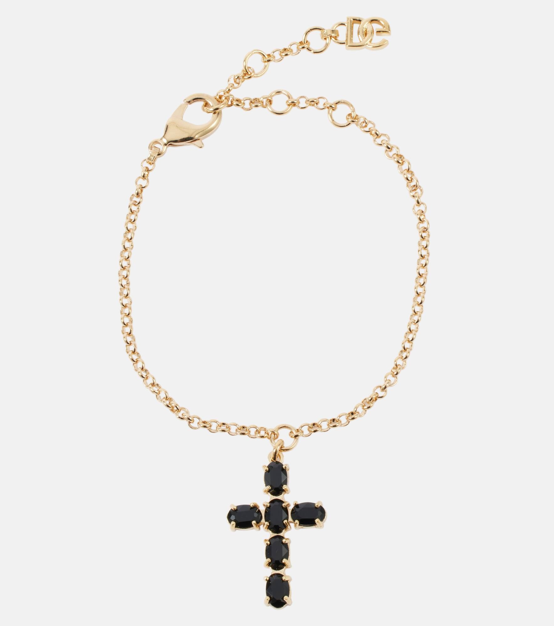 Elevate your accessory collection with this Dolce&Gabbana bracelet. Featuring a crystal-embellished cross charm as its centerpiece, the design is secured by a lobster clasp and finished with a dangling DG charm. Product Details - Material: brass, glass - Made in Italy - Designer color name: Oro - Includes: box, dust bag - Closure: lobster-clasp fastening - Item number: P00995489 Size & Fit - Adjustable length - Width 0,2cm-0" - Pendant length 2,8cm-1" - Pendant width 1,7cm-0.5" - Min. length 16,5cm-6.5" - Max. length 21,5cm-8.5"