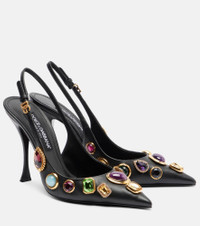 Sicilian culture is at the heart of Dolce&Gabbana's aesthetic, which attributes most of its bold styles to its Italian heritage. These slingback pumps are made from leather and finished with pointed toes, colorful rhinestones, and DG embellishments at the ankle straps. Product Details - Upper: lamb leather - Lining: lamb leather - Sole: leather insole and sole - Toe shape: pointed toe - Made in Italy - Includes: shoe box - Designer color name: Nero - Item color: black - Hardware color: gold - Slingback strap - Item number: P01075353 Size & Fit - True to size - European sizes - 10,5cm-4" heel (size EU 38)