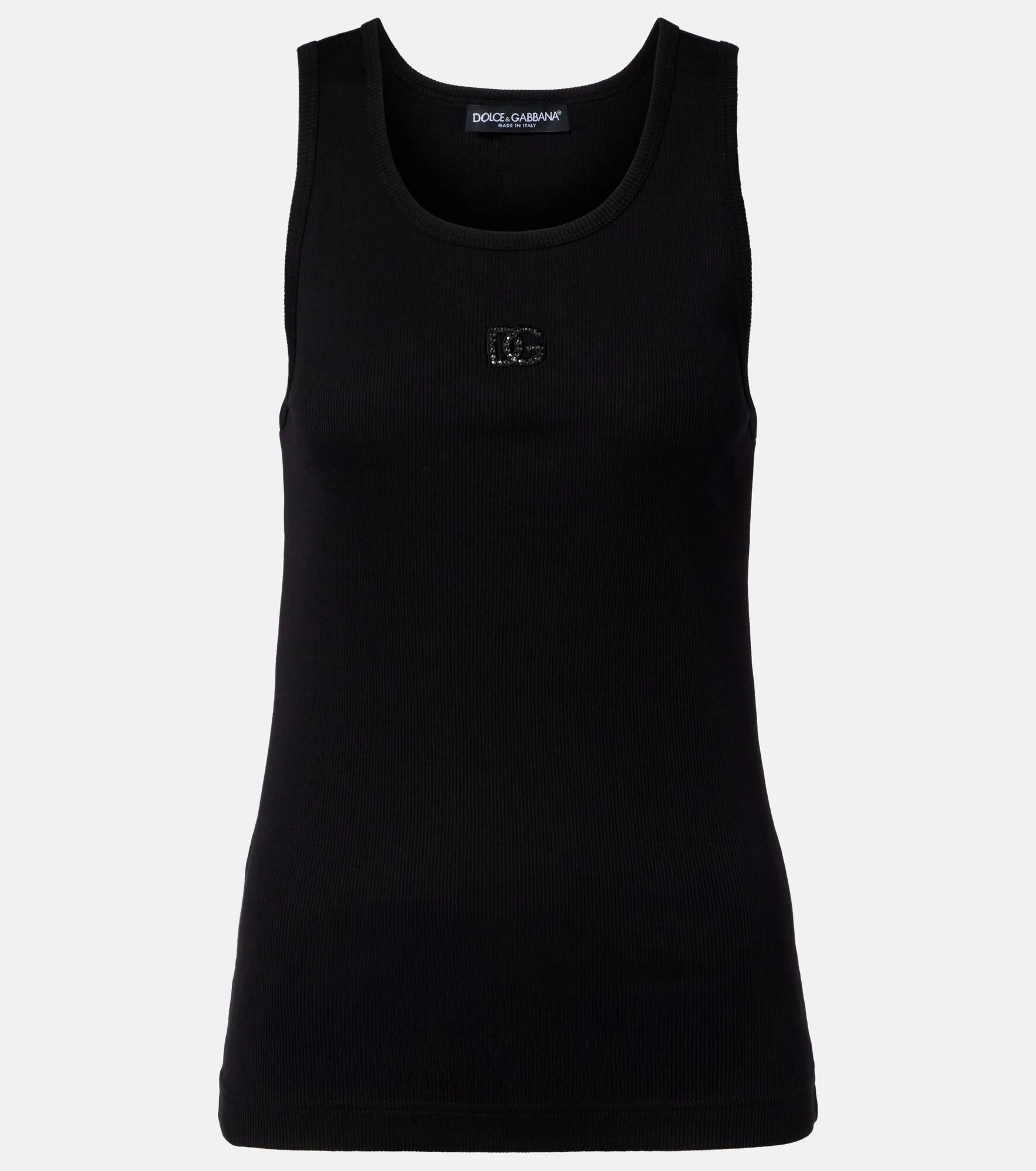 This Dolce&Gabbana tank top is made from pure cotton with a ribbed-knit finish. The sheath design is finished with a scoop neckline and an embellished DG logo embroidery for a dazzling, distinctive touch. Product Details - Material: 100% cotton - Care instructions: machine wash at 30 degrees - Made in Italy - Color: black - Designer color name: Nero - Trim: 100% cotton - Embroidery: 60% glass, 40% polyester - Item number: P01122837 Size & Fit - True to size - Fitted - Stretchy fabric - Falls to the hip - The model seen in the picture is 178cm-5'10" and wearing a size IT 40