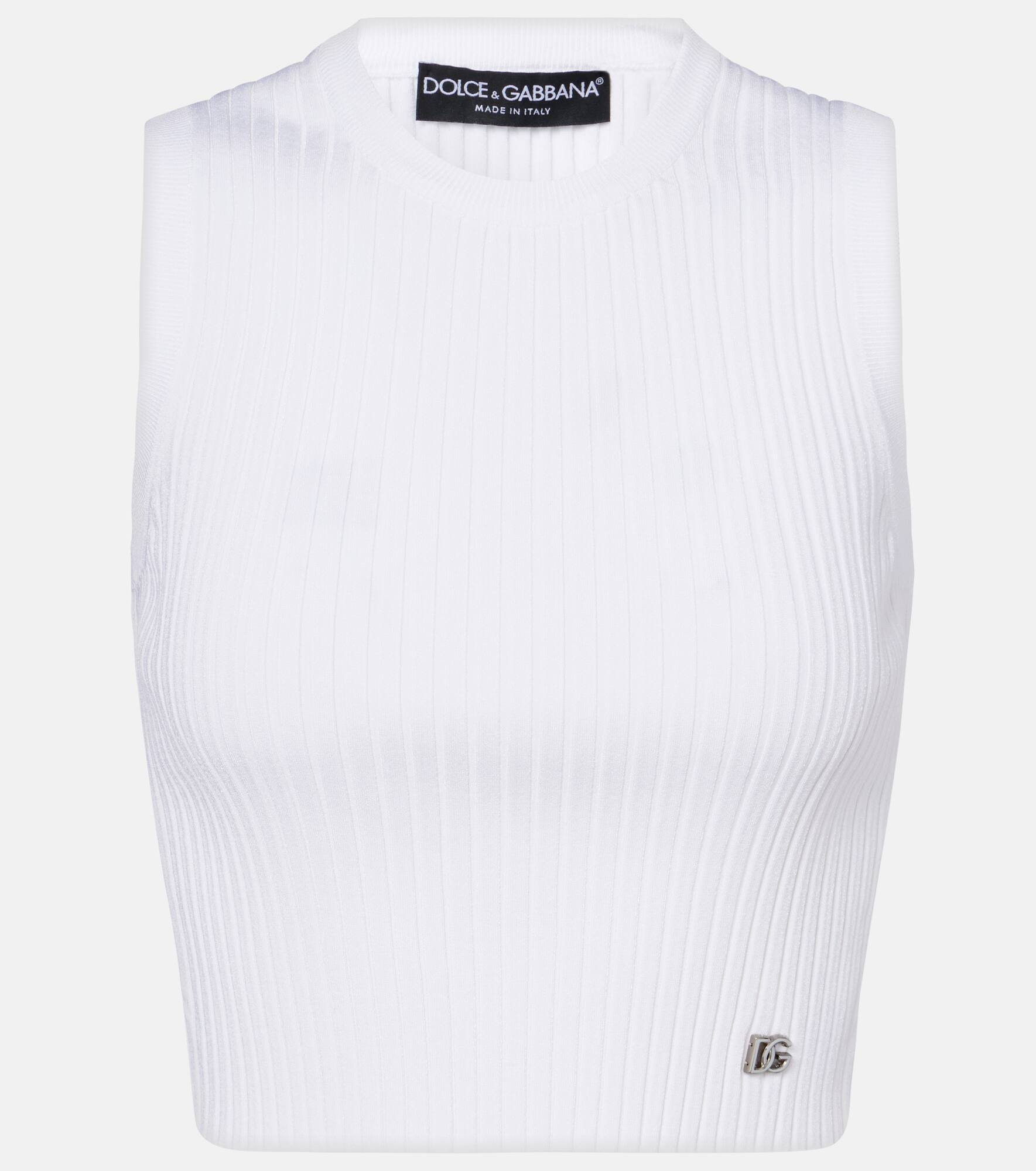Sicilian culture is at the heart of Dolce&Gabbana's aesthetic, which attributes most of its bold styles to its Italian heritage. This tank top features a ribbed texture and subtly showcases the DG motif at the bottom. Product Details - Material: 47% polyamide, 41% viscose, 9% polyester, 3% polyurethane - Care instructions: dry clean - Made in Italy - Designer color name: BIanco Ottico - Item color: white - Material II: 100% zamak - Collar: crewneck - Item number: P01041112 Size & Fit - True to size - Fitted - Stretchy fabric - Cropped - The model seen in the picture is 178cm-5'10", cup size %cupsize%, and wearing a size IT 40