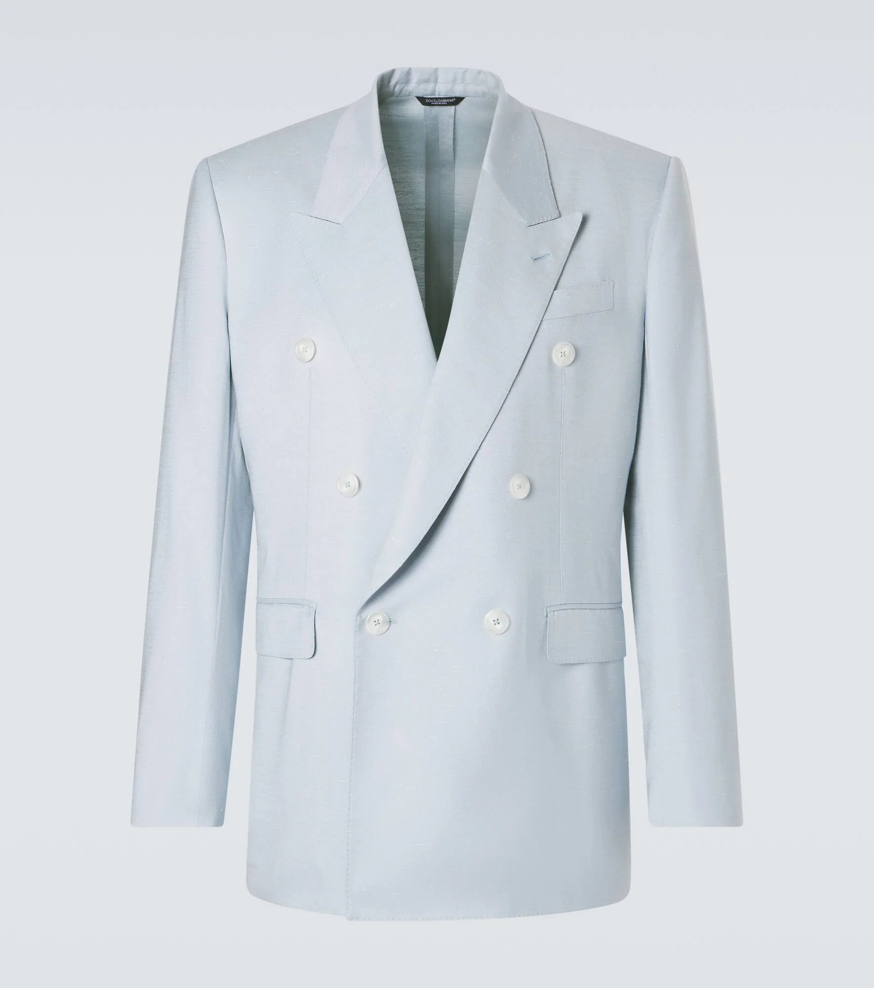 Dolce&Gabbana's applies time-honored techniques to every tailored piece, blending traditional elegance with modern style. This double-breasted blazer features peak lapels and an oversized silhouette. Product Details - Material: 94% viscose, 4% silk, 2% elastane - Care instructions: dry clean - Made in Italy - Color: blue - Designer color name: Powder Blue - Lining: 76% acetate, 24% silk - Peak lapel - Cuff: four buttons - Pockets: breast pocket, flap pockets, internal pockets - Closure: double-breasted (six buttons) - Vent: double - Item number: P01135657 Size & Fit - True to size - Shoulder pad inserts - Regular fit - Non-stretchy fabric - Falls below the hip - Height of model is 189cm-74.5" and wears a size 50
