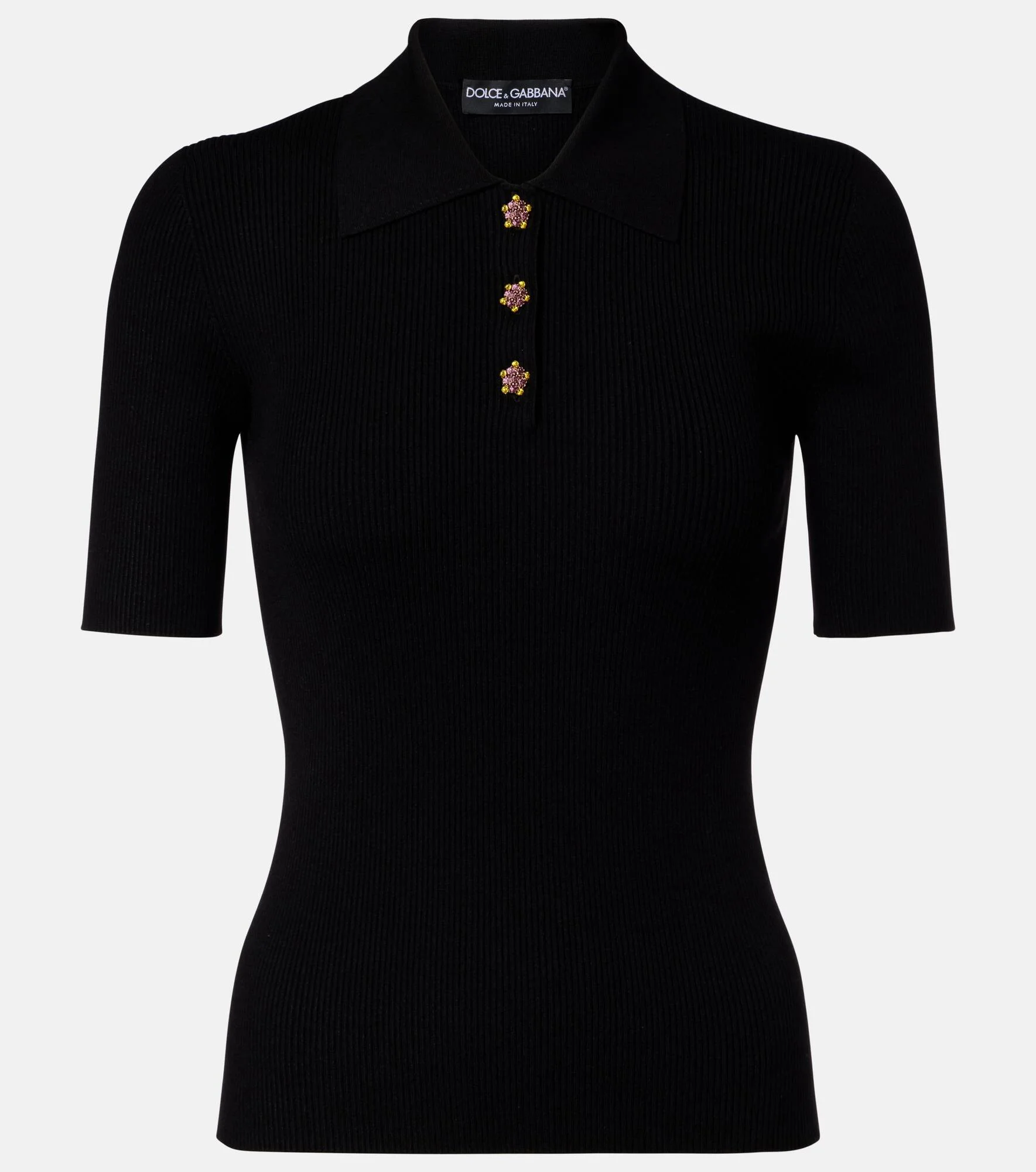 Sicilian culture is on display in Dolce&Gabbana's aesthetic, with bold styles inspired by the brand's Italian heritage. This ribbed-knit polo shirt elevates a classic style with its crystal-embellished buttons. Product Details - Material: 72% viscose, 28% polyester - Care instructions: hand wash - Made in Italy - Color: black - Designer color name: Nero - Details: 70% crystal, 30% brass - Collar: polo collar - Item number: P01121422 Size & Fit - True to size - Fitted - Stretchy fabric - Falls to the hip - The model seen in the picture is 178cm-5'10" and wearing a size IT 40