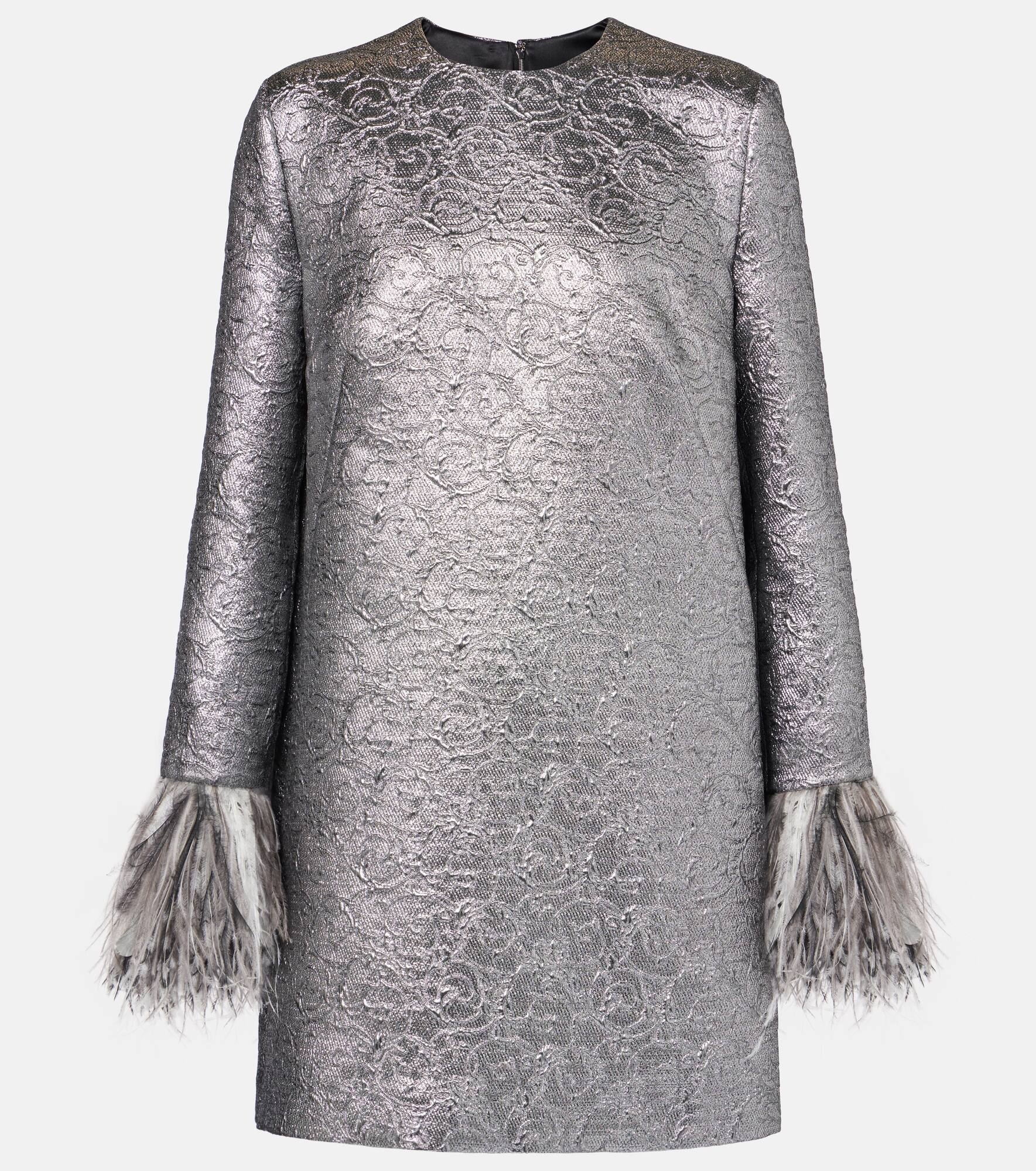 Quilted lamé jacquard sack minidress with feathered cuffs