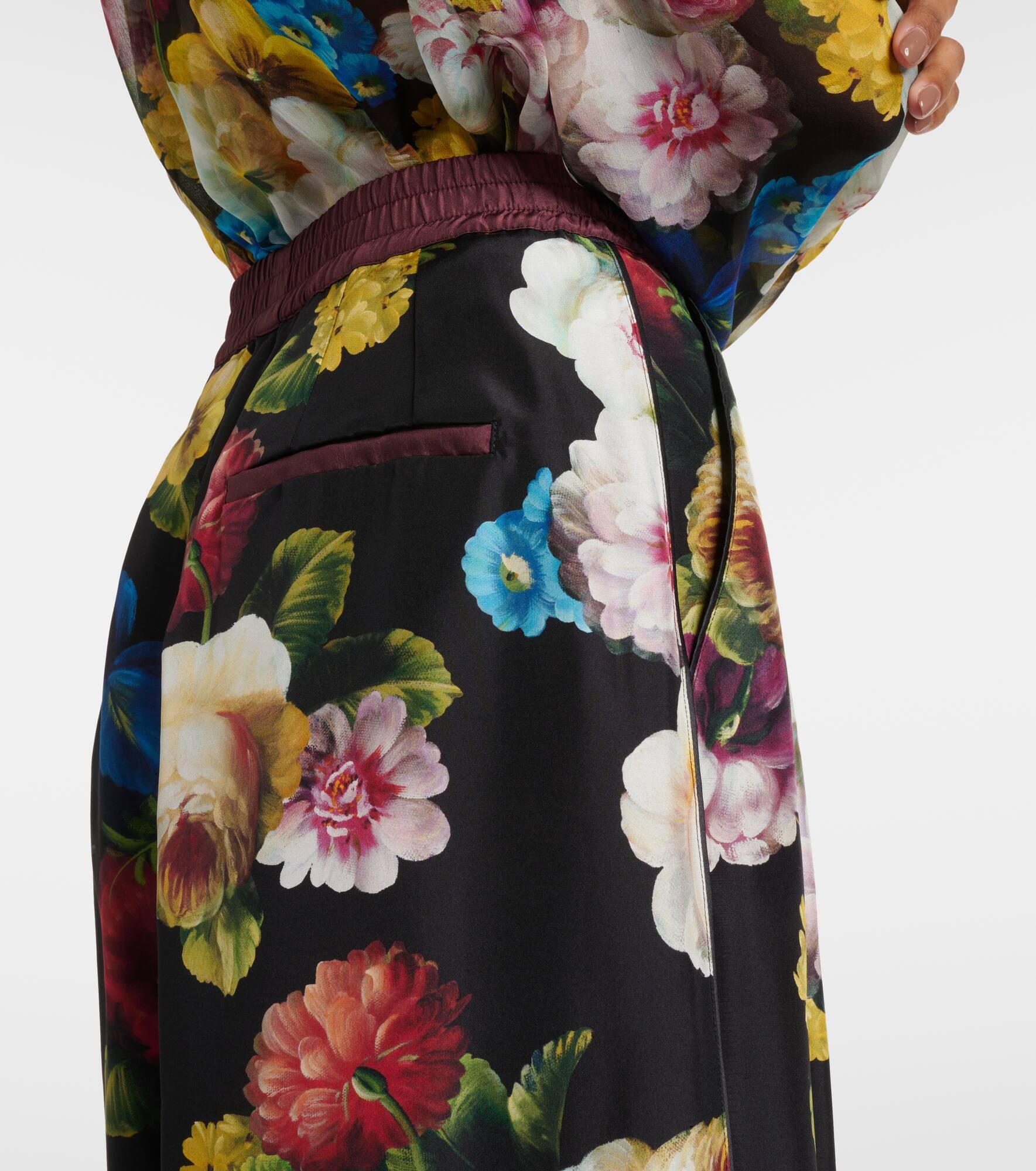 Product Details - Material: 100% silk - Care instructions: dry clean - Made in Italy - Designer color name: Fiore Nott.Bord Rosa - Closure: zipper fly, button fastening - Pockets: side slit pockets, back pockets - Elasticated waistband - Item number: P00901958 Size & Fit - True to size - Non-stretchy fabric - Wide-leg - High-waisted - The model seen in the picture is 178cm-5'10" and wearing a size IT 40