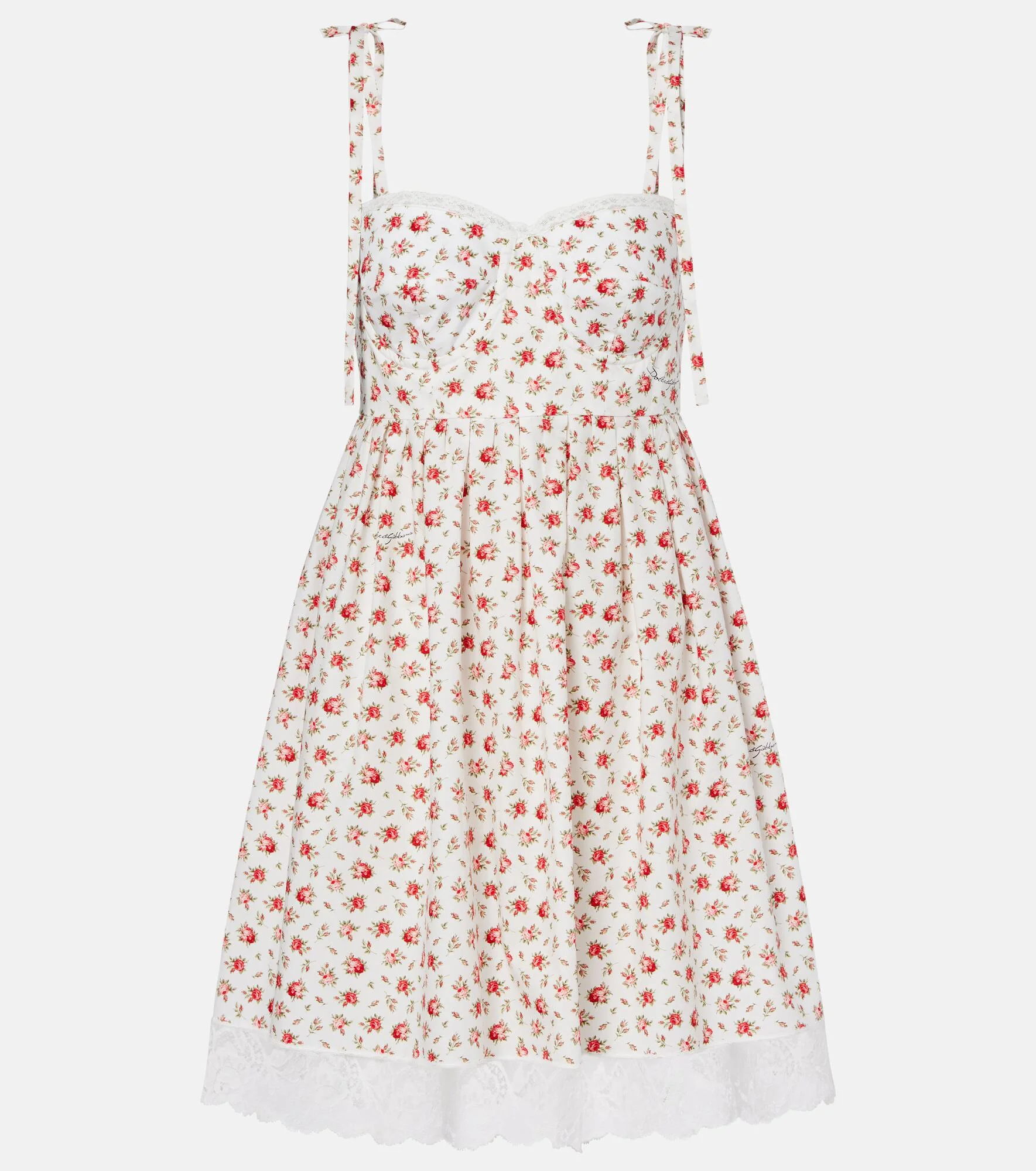 Sicilian culture is on display in Dolce&Gabbana's aesthetic, with bold styles inspired by the brand's Italian heritage. Made from cotton-blend poplin, this minidress is designed with lace trims and printed flowers for a romantic finish. Product Details - Material: 97% cotton, 3% polyamide - Care instructions: dry clean - Made in Italy - Color: white - Designer color name: Roselline F.Bco - Lining: 100% cotton - Closure: concealed zipped back - Underwired cups - Boning - Pockets: side slit pockets - Item number: P01122794 Size & Fit - True to size - Cinched waist - Elasticated hem - Non-stretchy fabric - The model seen in the picture is 178cm-5'10" and wearing a size IT 40