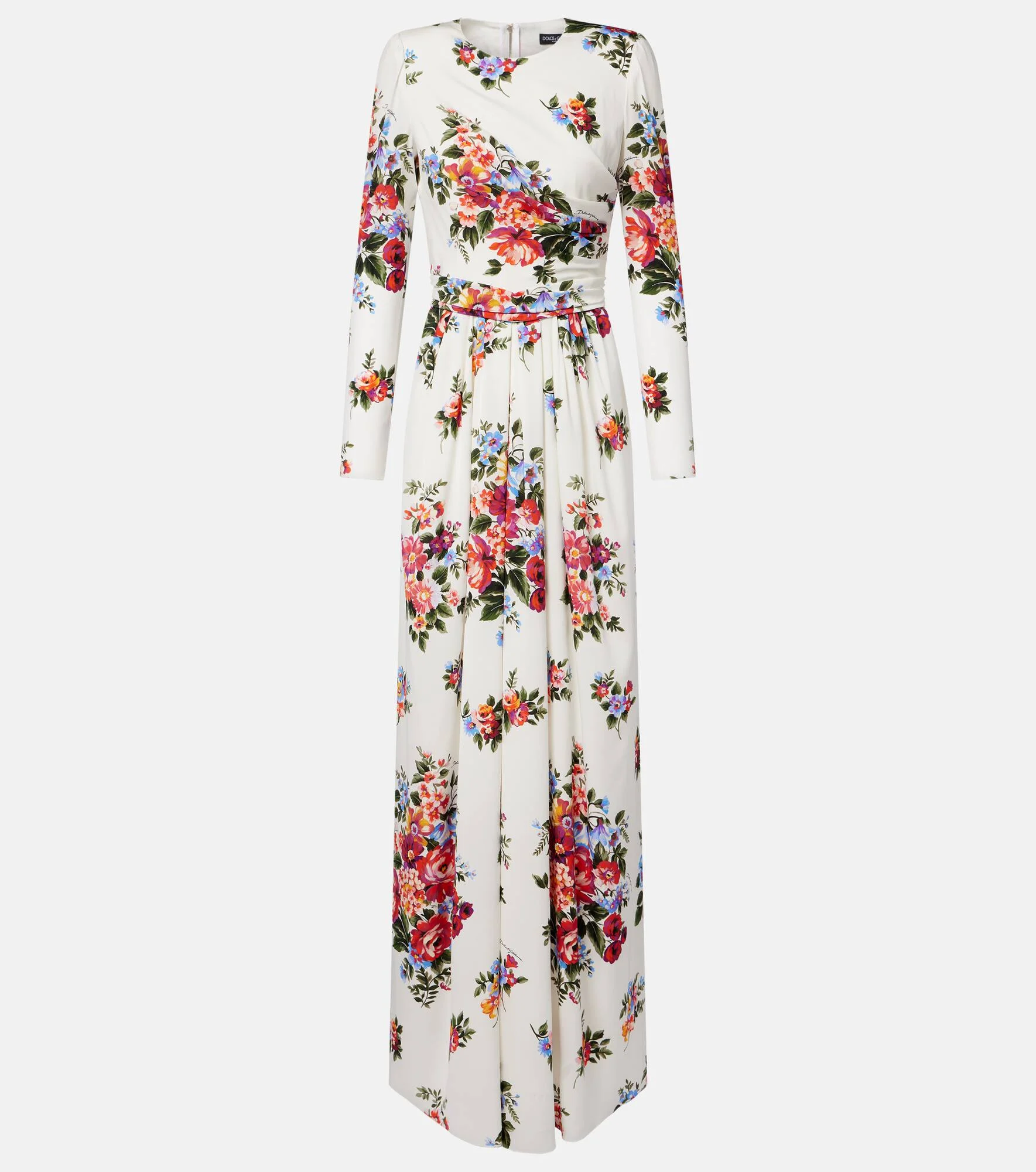 Sicilian culture is on display in Dolce&Gabbana's aesthetic, with bold styles inspired by the brand's Italian heritage. Italian-made from silk-blend charmeuse, this long-sleeved gown is adorned with a colorful floral print and finished with padded shoulders. Product Details - Material: 89% silk, 11% elastane - Care instructions: dry clean - Made in Italy - Color: white - Designer color name: Mazz.Fiori F.Bianco - Lining: 91% silk, 9% elastane - Closure: concealed zipped back - Shoulder pads - Item number: P01122854 Size & Fit - True to size - Cinched waist - Slightly stretchy fabric - Height of model is 180cm-71" and wears a size IT 40