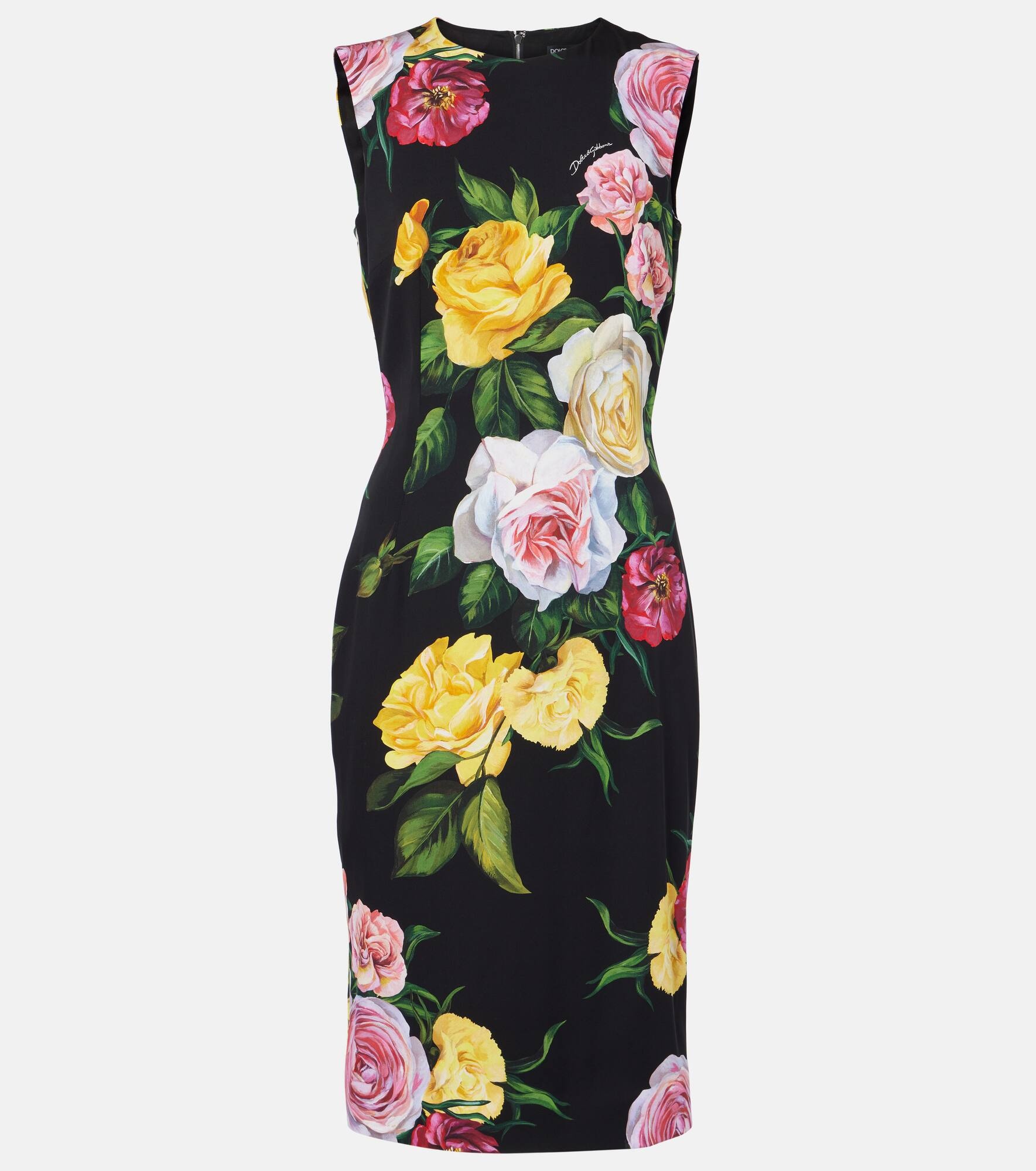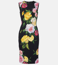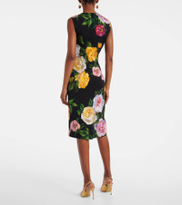 Charmeuse calf-length sheath dress with peony and rose print