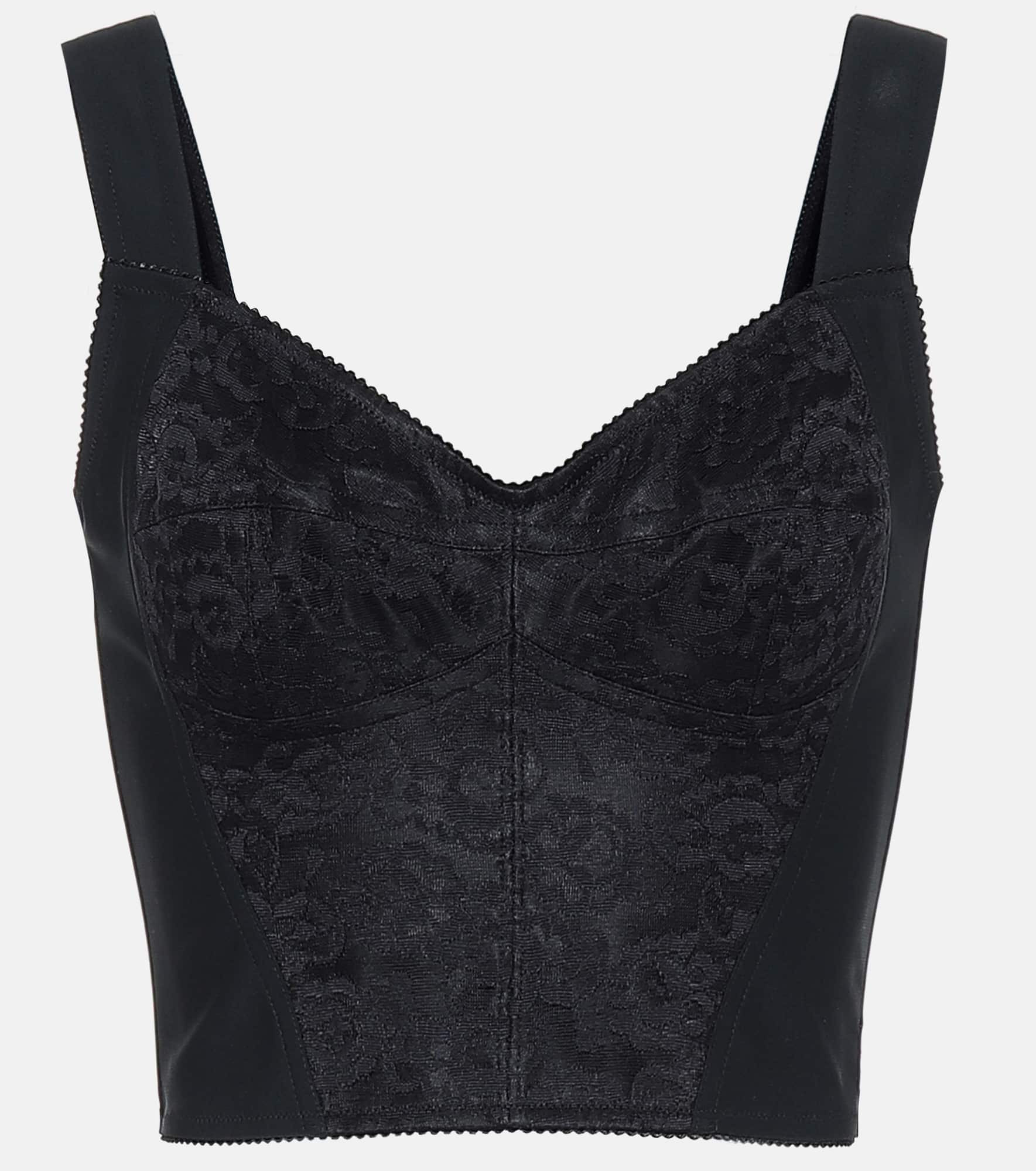 Allow Dolce & Gabbana to usher boudoir-inspired silhouettes into your wardrobe with this black bustier. Crafted in Italy from form-fitting jacquard, it's detailed with intricate lace trim for elevated feminine appeal. Show off its sweetheart neckline with a low-cut blazer. - material: 94% polyamide, 6% elastane - lining: 100% polyamide, partially lined - care instructions: dry clean - zipped back - Made in Italy - Designer colour name: Black - Runs large, please see Size & Fit tab
