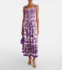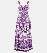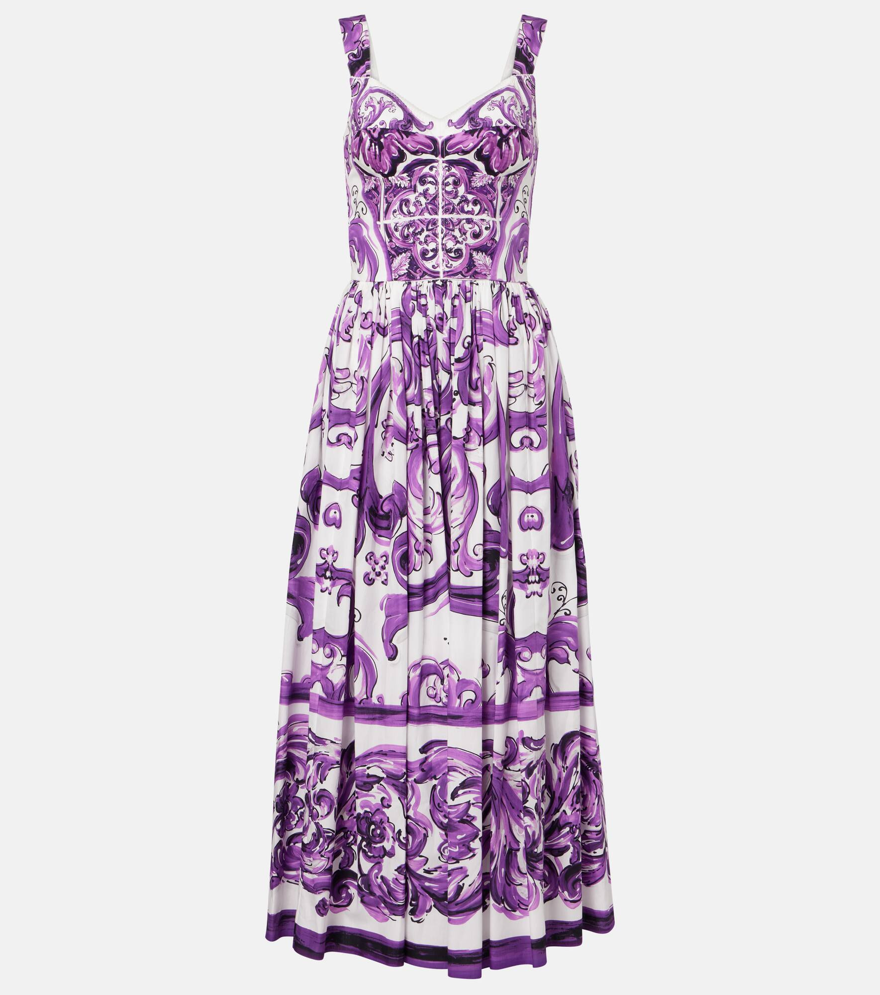 Sicilian culture is at the heart of Dolce&Gabbana's aesthetic, which attributes most of its bold styles to its Italian heritage. Made from pure cotton, this corset maxi dress features the brand's signature Majolica print in purple. Product Details - Material: 100% cotton - Care instructions: dry clean - Made in Italy - Designer color name: Mix Maiolic aL Viola - Item color: purple, white - Lining: 100% cotton - Closure: zipped back - Boning - Item number: P01041108 Size & Fit - True to size - Ideal fit for larger bust sizes - Cinched waist - Elasticated waist - Non-stretchy fabric - The model seen in the picture is 178cm-5'10" and wearing a size IT 40