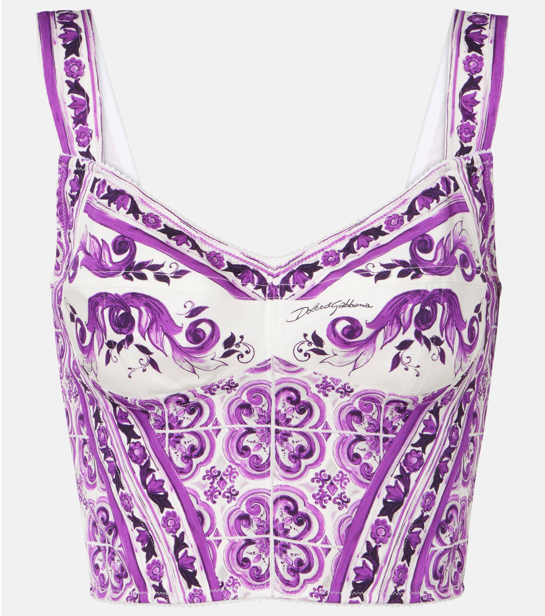 Sicilian culture is at the heart of Dolce&Gabbana's aesthetic, which attributes most of its bold styles to its Italian heritage. Made from a lustrous silk blend, this bustier top features the brand's signature Majolica print in purple. Product Details - Material: 67% silk, 24% polyamide, 9% elastane - Care instructions: dry clean - Made in Italy - Designer color name: Maiolica Viola - Item color: purple - Lining: 91% silk, 9% elastane - Closure: zipped back - Boning - Item number: P01041116 Size & Fit - Fits large to size - we recommend trying one size smaller - Ideal fit for larger bust sizes - Internal bra with wire support at the sides - Cinched waist - Non-stretchy fabric - Cropped - The model seen in the picture is 178cm-5'10" and wearing a size IT 38