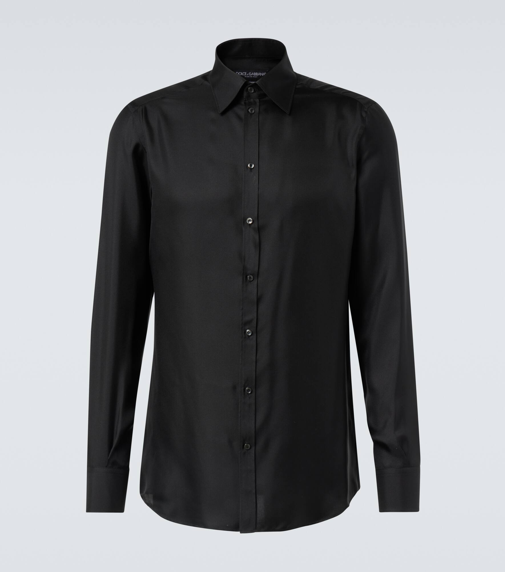 Crafted in Italy from breathable silk twill, this Martini shirt reflects Dolce&Gabbana's dedication to Italian craftsmanship and timeless elegance. The piece is finished with a pointed collar and rounded cuffs. Product Details - Material: 100% silk - Care instructions: dry clean - Made in Italy - Designer color name: Nero - Item color: black - Closure: buttoned placket - Collar: classic (Straight point) - Cuff: buttoned - Item number: P01077024 Size & Fit - True to size - With pleats in the back - Classic fit - Non-stretchy fabric - Falls below the hip - Height of model is 189cm-74.5" and wears a size EU 41
