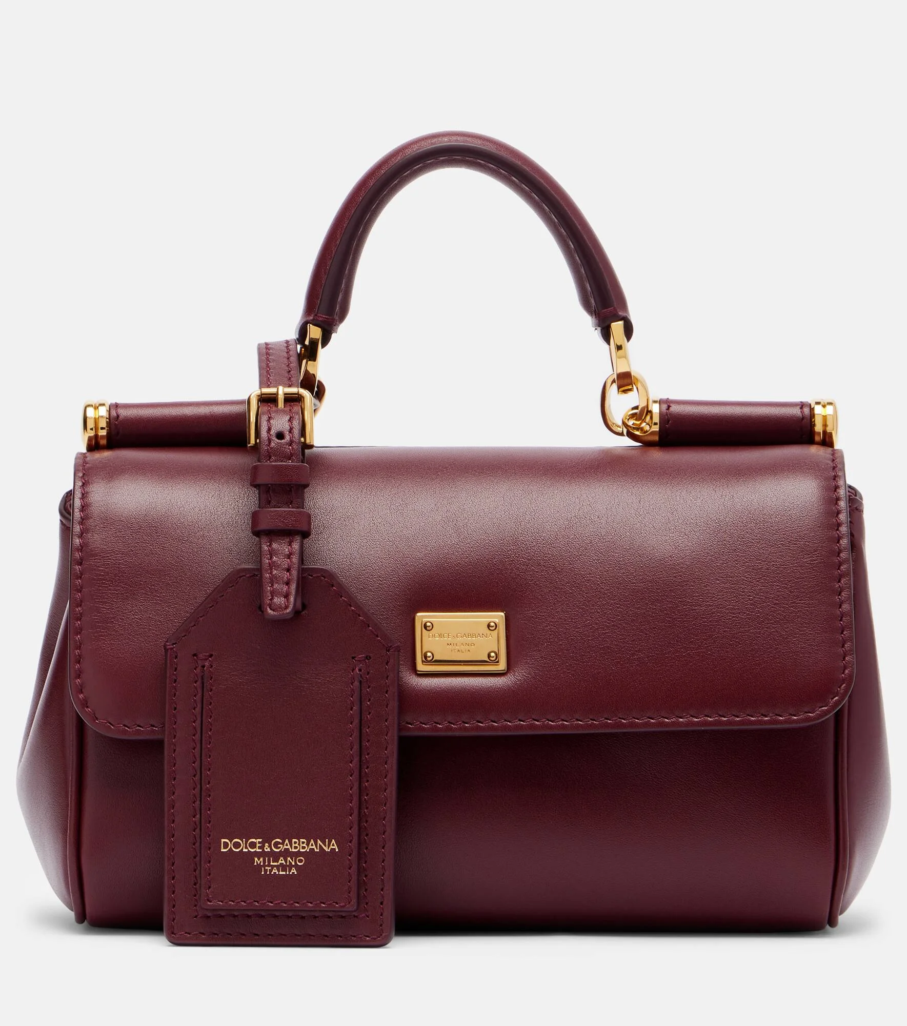 Sicilian culture is on display in Dolce&Gabbana's aesthetic, with bold styles inspired by the brand's Italian heritage. The My Sicily tote bag is crafted from burgundy-hued leather and boasts gold-toned hardware and a detachable shoulder strap. Product Details - Material: calf leather - Lining: leather - Made in Italy - Color: burgundy - Designer color name: Bordeaux - Item color: burgundy - Hardware color: gold - Top handle, Detachable, adjustable shoulder strap - Internal details: internal zipped pocket, single compartment - Detachable charm - Closure: push-lock fastening - Includes: dust bag - Item number: P01129314 Size & Fit - Height 12cm-4.5" - Width 18,5cm-7.5" - Depth 8cm-3" - Length of handle 17cm-6.5" - Adjustable shoulder strap - Min. length shoulder strap 104cm-41" - Max. length shoulder strap 122cm-48"