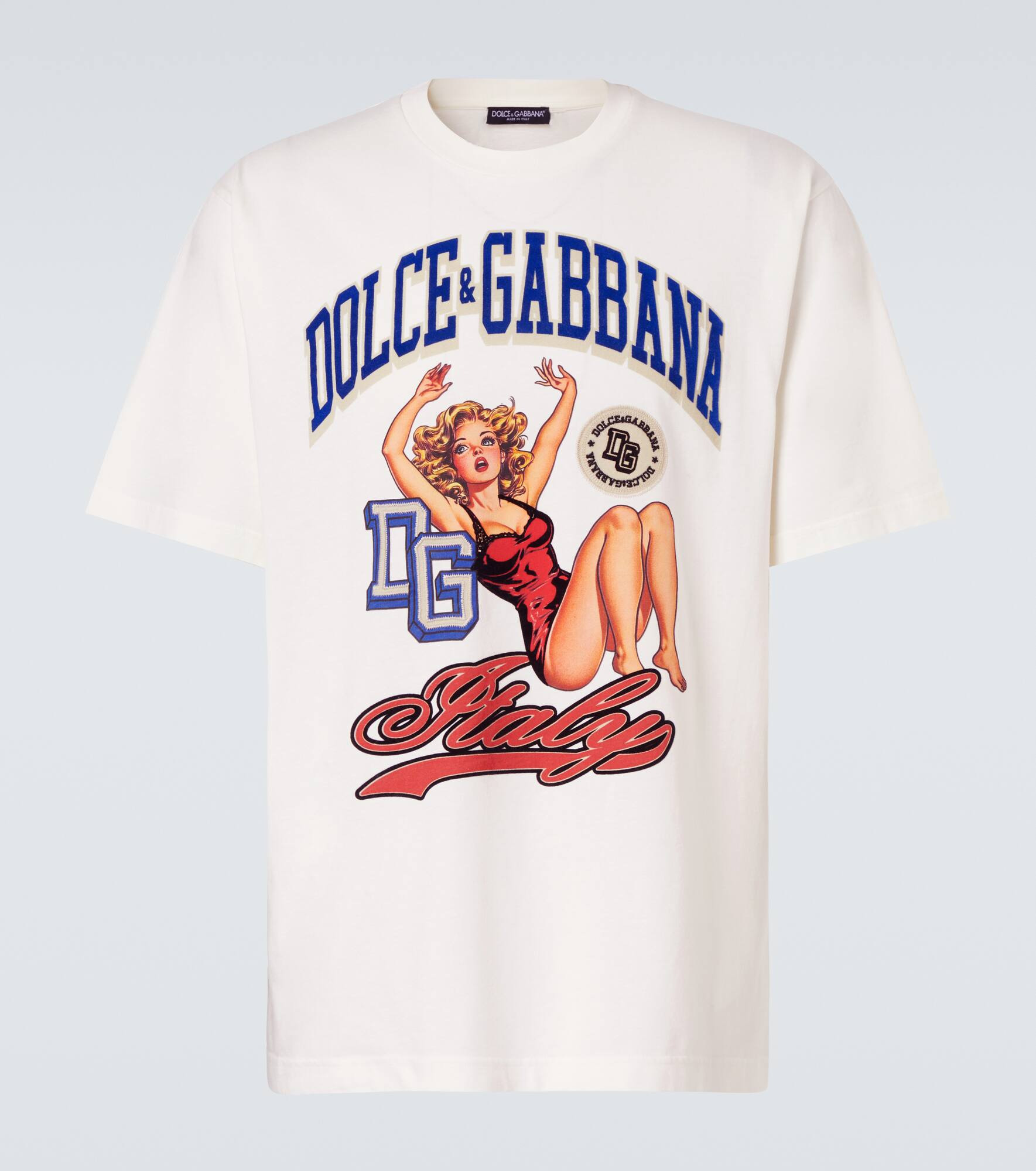 This cotton jersey T-shirt by Dolce&Gabbana channels a '60s aesthetic with its retro charm. Its design features a comic book–style print, complete with a bold logo accent. Product Details - Material: 100% cotton - Care instructions: machine wash at 30 degrees - Made in Italy - Designer color name: Panna - Item color: white - Details: 100% viscose - Embroidery: 100% polyester - Collar: crewneck - Item number: P01077072 Size & Fit - True to size - Dropped shoulders - Designed for a loose fit - Slightly stretchy fabric - Falls below the hip - Height of model is 188cm-74" and wears a size IT 50
