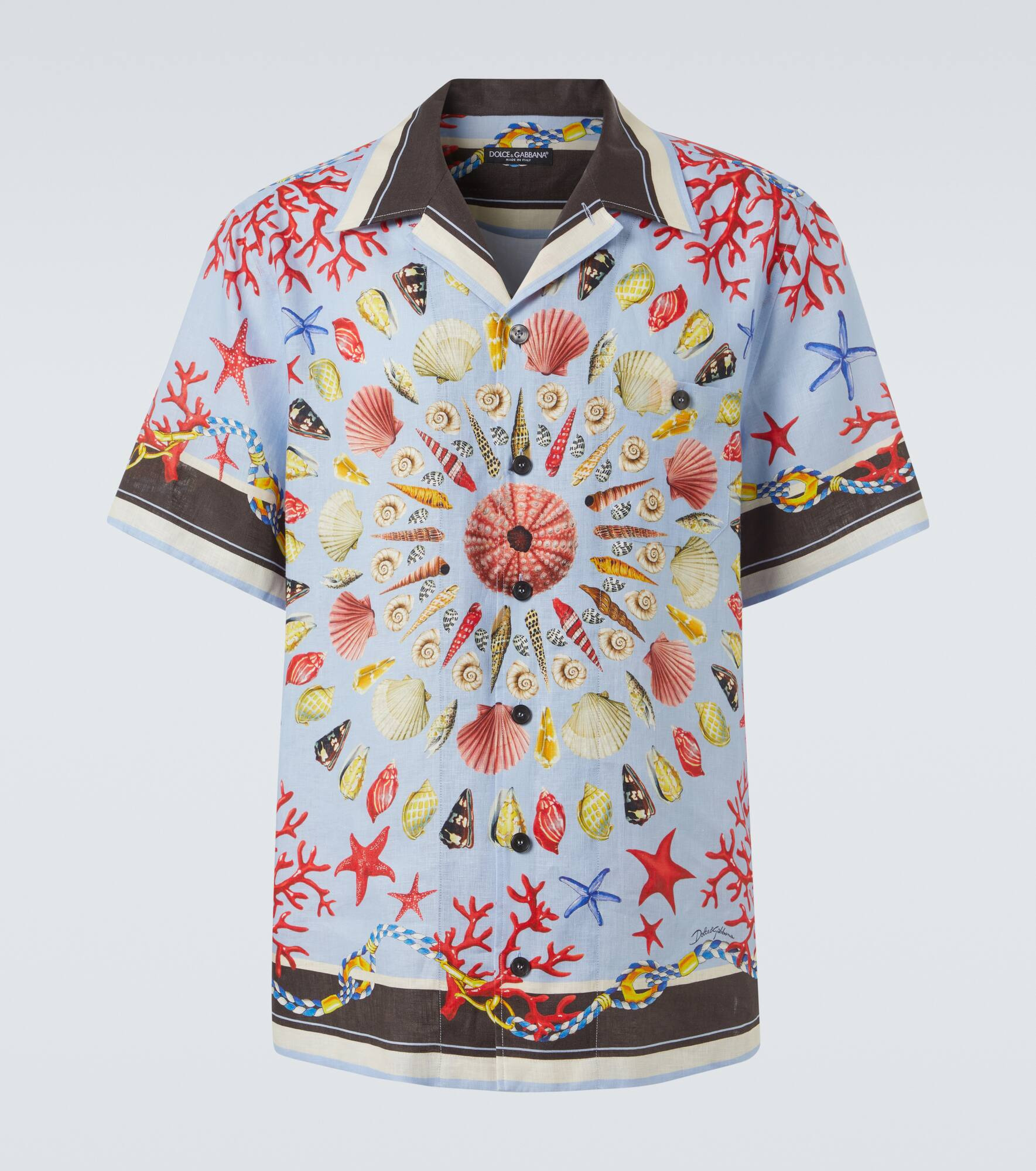 The beach is calling—and this charming Dolce&Gabbana bowling shirt is the perfect answer. Featuring a playful all-over shell print, the short-sleeve design is crafted from breathable linen canvas. Product Details - Material: 100% linen - Care instructions: machine wash at 30 degrees - Made in Italy - Designer color name: Conchiglie F.Avio - Item color: blue, multicolor - Closure: buttoned placket - Sleeves: short-sleeved - Collar: classic (Straight point) - Hem: uneven - Item number: P01077031 Size & Fit - True to size - Without pleats in the back - Classic fit - Non-stretchy fabric - Falls below the hip - Height of model is 189cm-74.5" and wears a size EU 41