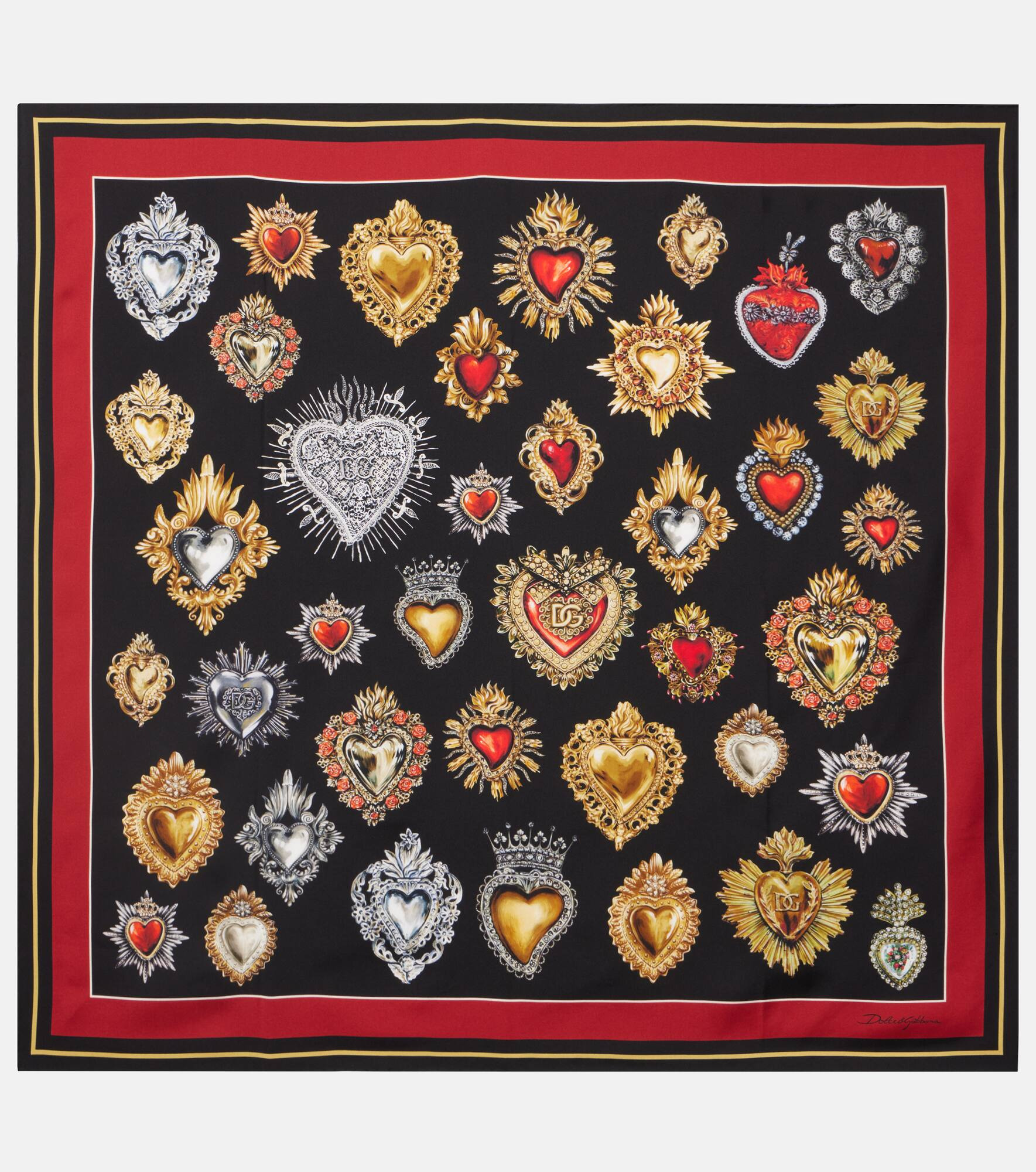 Sicilian culture is on display in Dolce&Gabbana's aesthetic, with bold styles inspired by the brand's Italian heritage. This scarf is presented in lustrous silk twill and decorated with printed signature symbols throughout. Product Details - Material: 100% silk - Care instructions: dry clean - Made in Italy - Designer color name: Cuori Sacri F.Nero - Item color: multicolor - Item number: P01110653 Size & Fit - Length 90cm-35.5" - Width 90cm-35.5"