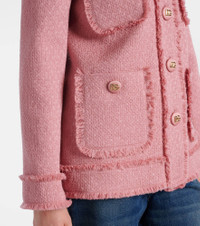 As part of the Women's DNA Collection, the Raschel wool-blend tweed jacket is defined by its textured finish. With cannete-covered DG buttons, a silk satin lining, and playful fringe trimming, it redefines timeless tailoring. Product Details - Material: 67% wool, 27% viscose, 6% polyamide - Care instructions: dry clean - Made in Italy - Designer color name: Rosa Polvere Scuro - Item color: pink - Closure: buttoned front - Pockets: buttoned pockets - Lining: 100% silk - Item number: P01009456 Size & Fit - True to size - Straight fit - Non-stretchy fabric - Falls below the hip - The model seen in the picture is 178cm-5'10" and wearing a size IT 40