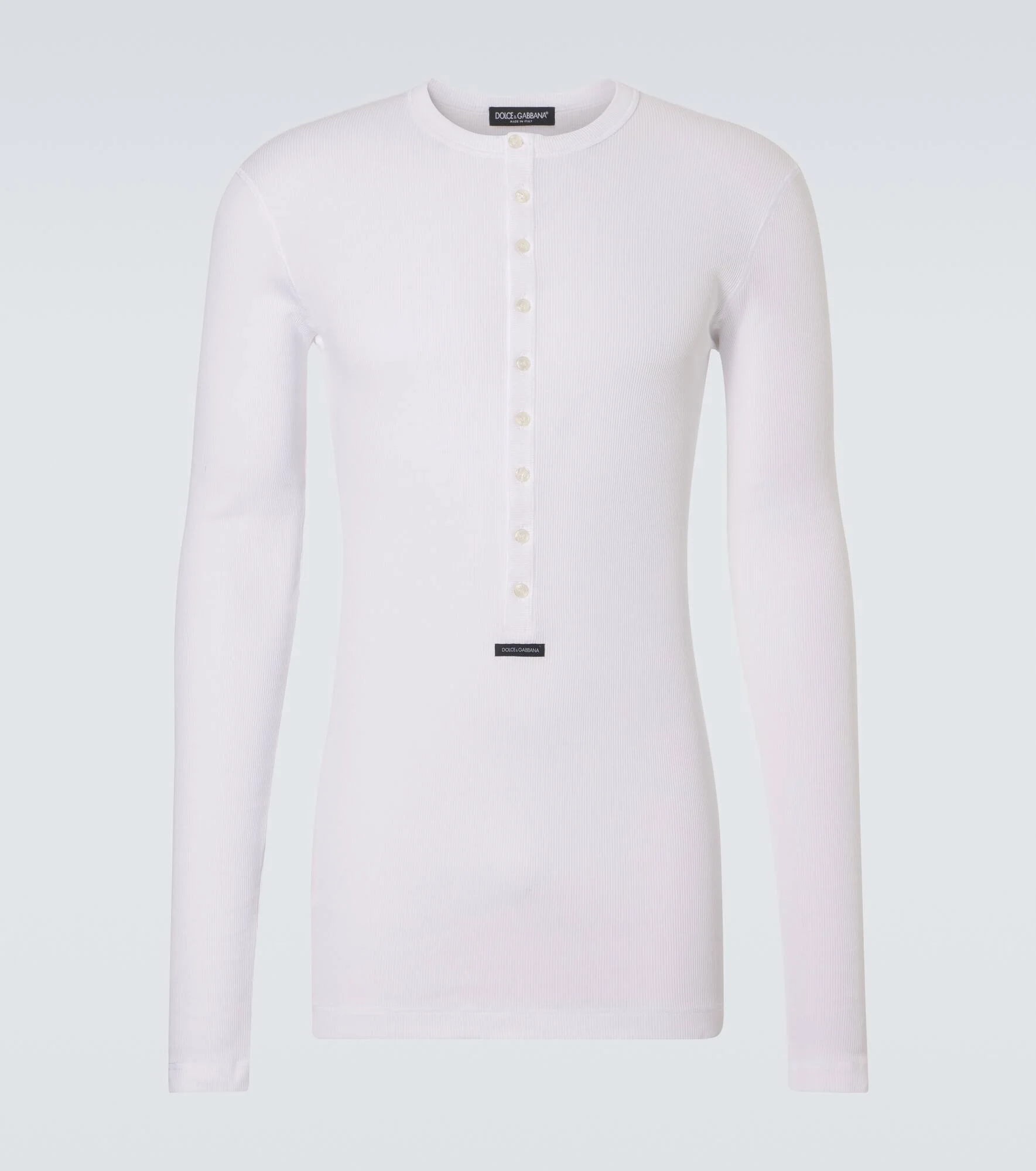 A minimalist style to wear on repeat, this Henley shirt from Dolce&Gabbana promises maximum ease. The design is made from ribbed cotton for a skintight fit and finished with subtle branding on the front. Product Details - Material: 100% cotton - Care instructions: machine wash at 30 degrees - Made in Italy - Color: white - Designer color name: Optical White - Closure: partially buttoned front - Item number: P01135684 Size & Fit - True to size - Semi-sheer - Slim fit - Stretchy fabric - Falls below the hip - Height of model is 189cm-74.5" and wears a size IT 50