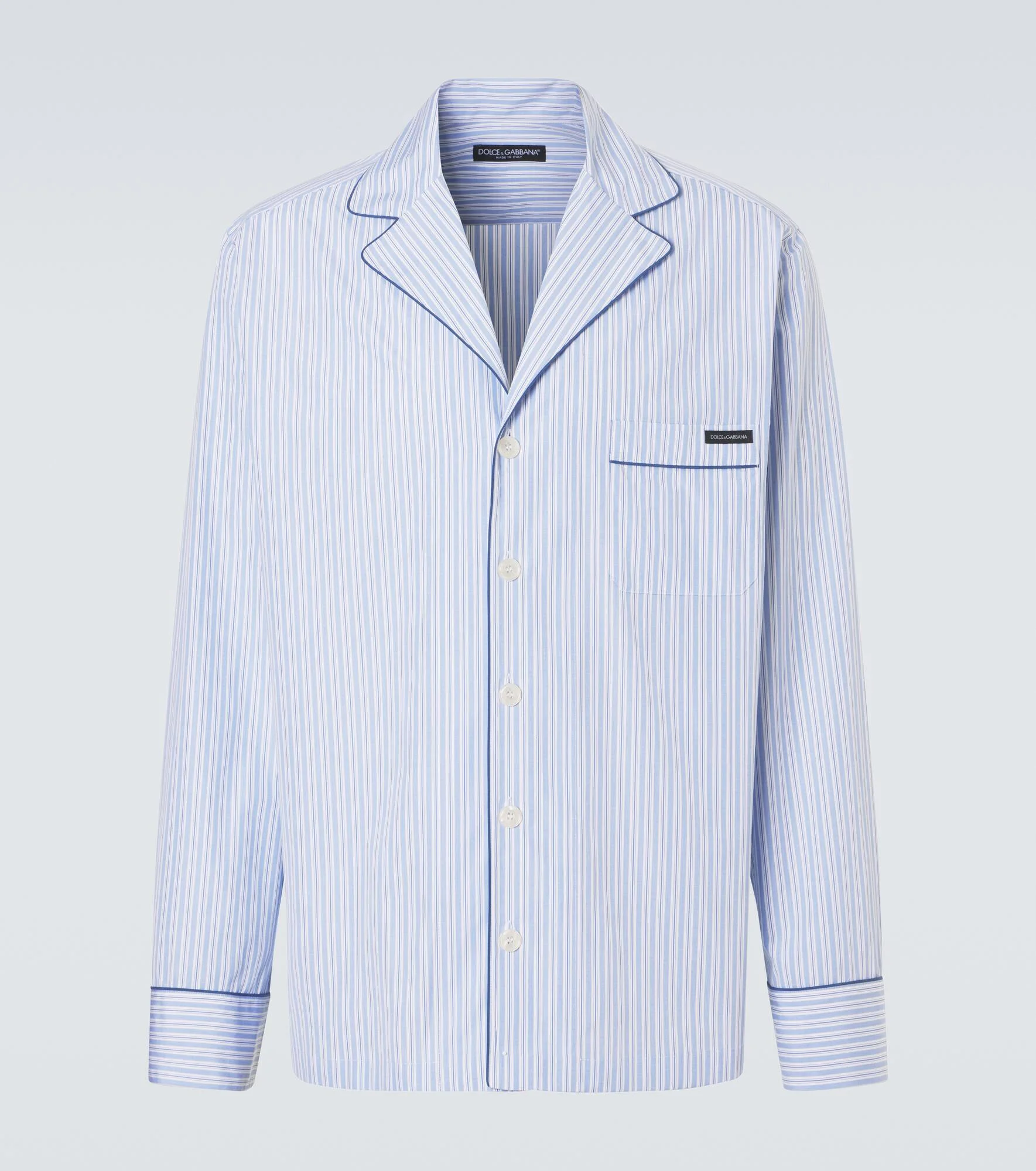 This pajama shirt from Dolce&Gabbana seamlessly combines refinement and ease. The style is made from cotton poplin with a touch of silk, featuring a striped pattern and contrasting piping. Product Details - Material: 98% cotton, 2% silk - Care instructions: dry clean - Made in Italy - Color: blue - Designer color name: Striped - Closure: buttoned front - Side slits - Pockets: chest patch pocket - Collar: notch neck - Item number: P01135655 Size & Fit - True to size - Dropped shoulders - Designed for a loose fit - Non-stretchy fabric - Falls below the hip - Height of model is 189cm-74.5" and wears a size EU 41