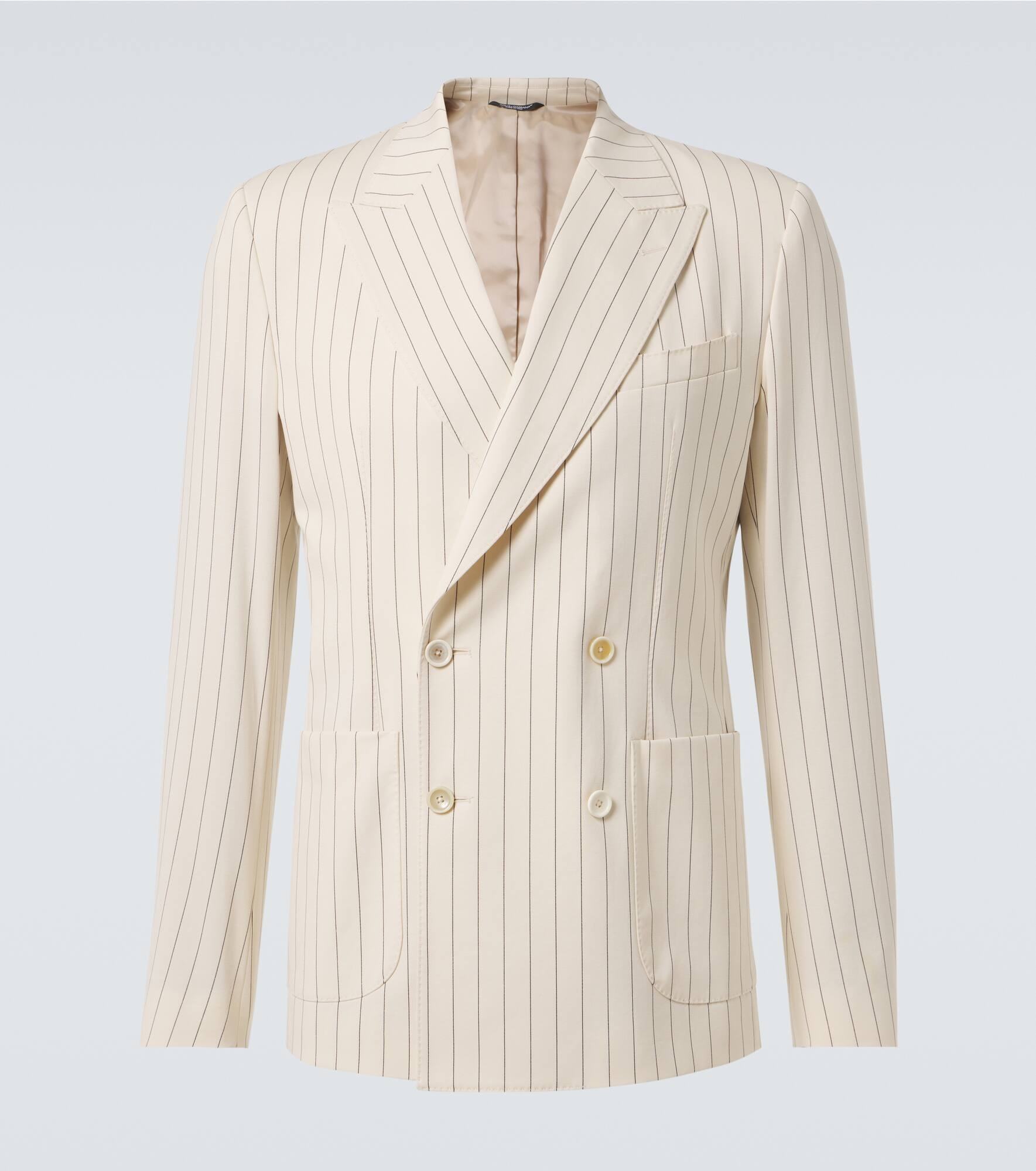 The time-honored tailoring techniques of Dolce&Gabbana blend traditional elegance with modern sophistication. This cotton-blend blazer features a striped design and sleek patch pockets as well as double-breasted closure. Product Details - Material: 52% cotton, 40% nylon, 8% elastane - Care instructions: dry clean - Made in Italy - Designer color name: Striped - Lining: 55% polyester, 45% viscose - Pockets: patch pockets - Closure: double-breasted (four buttons) - Item number: P00984486 Size & Fit - True to size - Shoulder pad inserts - Slim fit - Non-stretchy fabric - Falls below the hip - Height of model is 189cm-74.5" and wears a size IT 50